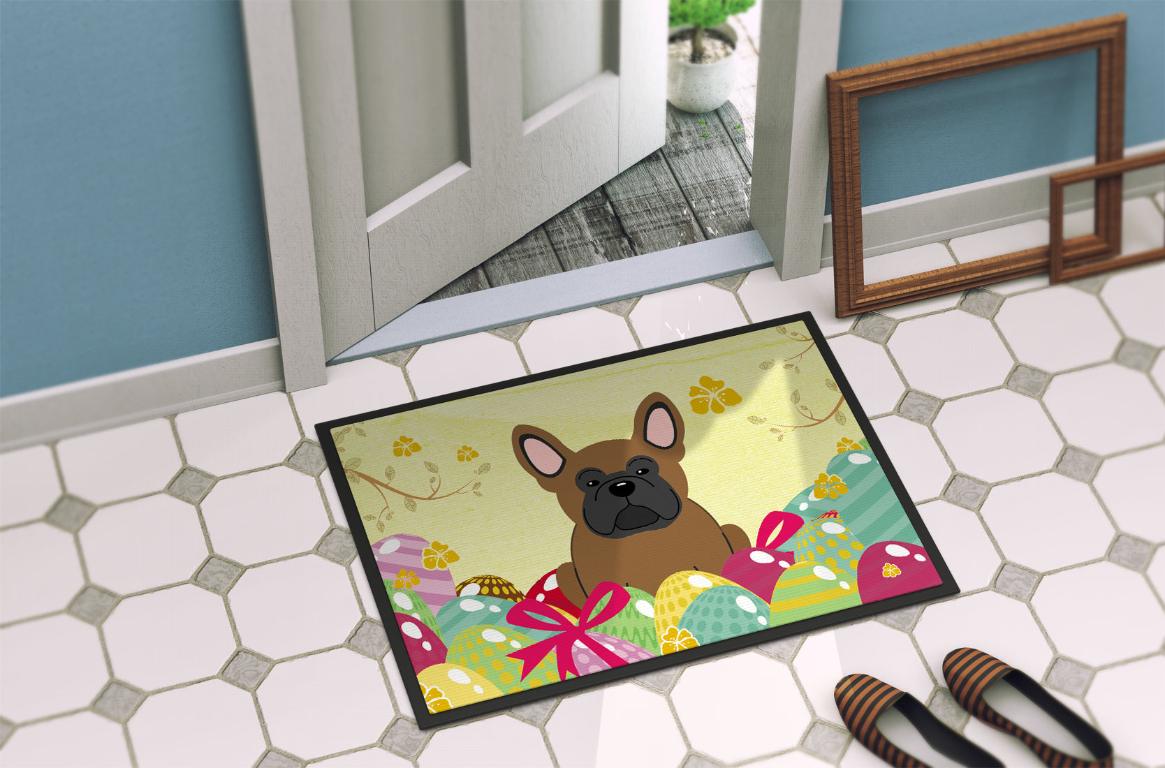 Decorate your space with our Easter French Bulldog artwork on a Doormat. Welcome your guests in style with our Artwork Door Mat, designed to withstand almost any weather condition. This mat, measuring approximately 24 by 36 inches, is held together by durable black binding tape. Its top layer, composed of polyester felt, is dyed with the eye-catching image you see on the mat. A few layers below provide the mat with stability, while its rubber bottom is stamped to help prevent slipping and ensures safety. Our mat works wonderfully as both an indoor or outdoor door mat. For cleaning, simply hose it off with water or use a power washer - no need for any cleaner that produces suds. Avoid scrubbing with a brush, instead, opt for the vacuum on floor setting. Designed manufactured and printed in the USA, this mat is a perfect addition to your porch, outdoor kitchen, entryway, or any indoor space. Its unique design makes it a charming decorative rug that greets your guests and adds a stylish touch to your home decor.
