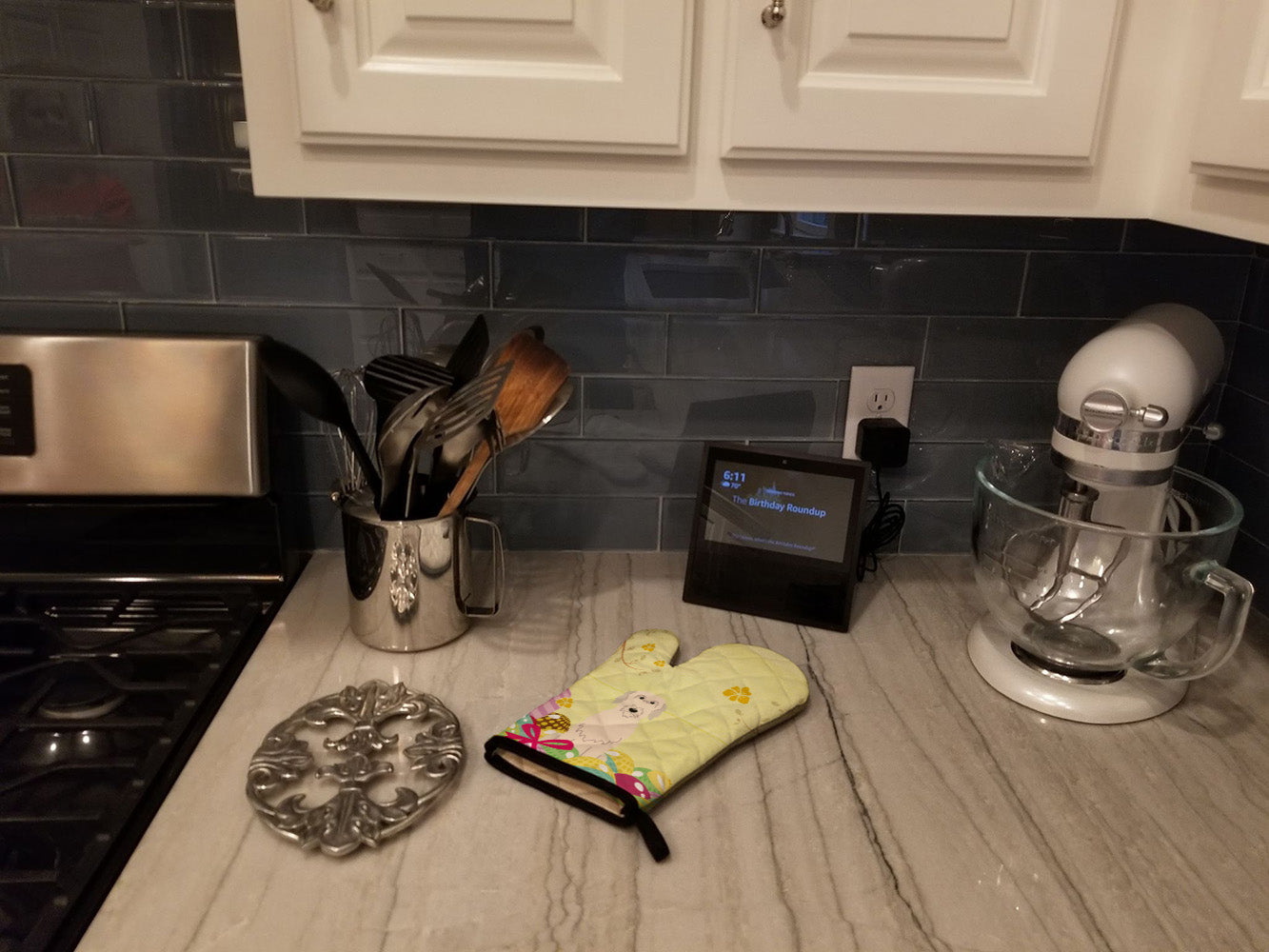 Decorate your space with our Easter Irish Wolfhound artwork on a Oven Mitt. Presenting our Large Right Hand Thick Heat Resistant Oven Mitt, an indispensable tool for any culinary enthusiast. This mitt boasts layers of quilted protection on both sides, providing outstanding resistance against extreme heat. Embellished with beautifully printed artwork, it adds an extra dash of charm to your kitchen decor. At about 12 inches long and 8 1/2 inches wide, this oven mitt offers a generous fit, accommodating a diverse range of hand sizes. Its design is enhanced by a sleek Black bias tape trim, finished with a convenient hoop for easy hanging. Fresh out of the packaging, the quilting process may give the mitt a stiff feel, but rest assured, it will soften with use and washing. Our mitt is crafted with a unique center fabric, Insul-Bright, a composite material made from polyester fibers, needle-punched through a nonwoven substrate and a reflective metallized film. This smart material resists both conduction and radiant energy, reflecting heat back to its source, all while remaining breathable. Our oven mitt is machine washable and safe for tumble drying. It's a perfect gift for your favorite Chef, BBQ enthusiast, or just a little treat for yourself! Experience safety, style, and convenience rolled into one with this exceptional oven mitt.