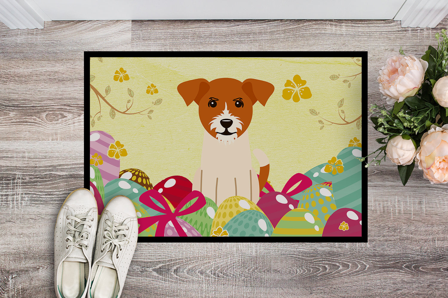 Decorate your space with our Easter Jack Russell Terrier artwork on a Doormat. Welcome your guests in style with our Artwork Door Mat, designed to withstand almost any weather condition. This mat, measuring approximately 18 by 27 inches, is held together by durable black binding tape. Its top layer, composed of polyester felt, is dyed with the eye-catching image you see on the mat. A few layers below provide the mat with stability, while its rubber bottom is stamped to help prevent slipping and ensures safety. Our mat works wonderfully as both an indoor or outdoor door mat. For cleaning, simply hose it off with water or use a power washer - no need for any cleaner that produces suds. Avoid scrubbing with a brush, instead, opt for the vacuum on floor setting. Designed manufactured and printed in the USA, this mat is a perfect addition to your porch, outdoor kitchen, entryway, or any indoor space. Its unique design makes it a charming decorative rug that greets your guests and adds a stylish touch to your home decor.