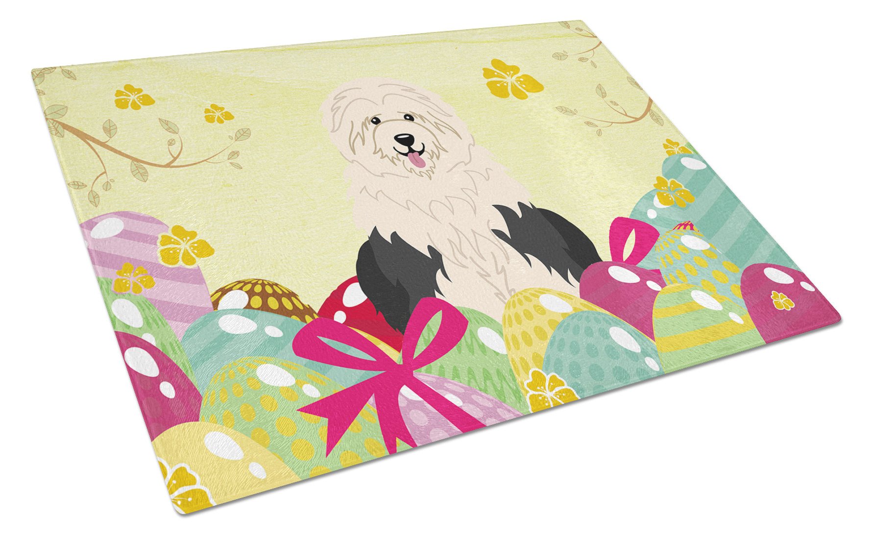 Decorate your space with our Easter Old English Sheepdog artwork on a Cutting Board. Introduce your kitchen to the vibrant, large Decorative Glass Cutting Board from Caroline's Treasures. Crafted from resilient tempered glass, this board is not only a utilitarian necessity but also a colorful art piece. With its generous dimensions of 15 inches in height and 12 inches in length, it offers ample space for all your cutting needs. Every piece showcases captivating artwork from distinguished artists, bringing an aesthetic edge to your kitchen. Beyond its attractive design, this cutting board ensures your countertop stays pristine and unscathed, owing to its heat-resistant properties. Engineered with user convenience in mind, it features non-skid feet for stability, and rounded corners for additional safety. Its robust construction renders it virtually unbreakable, guaranteeing longevity. The board comes with protective feet bumpers, maintaining its position during use. This product is recommended to be hand washed only. Proudly printed and assembled in the United States, this cutting board exemplifies superior craftsmanship. With Caroline's Treasures' Decorative Glass Cutting Board, you're investing in a blend of functionality and artistic flair.