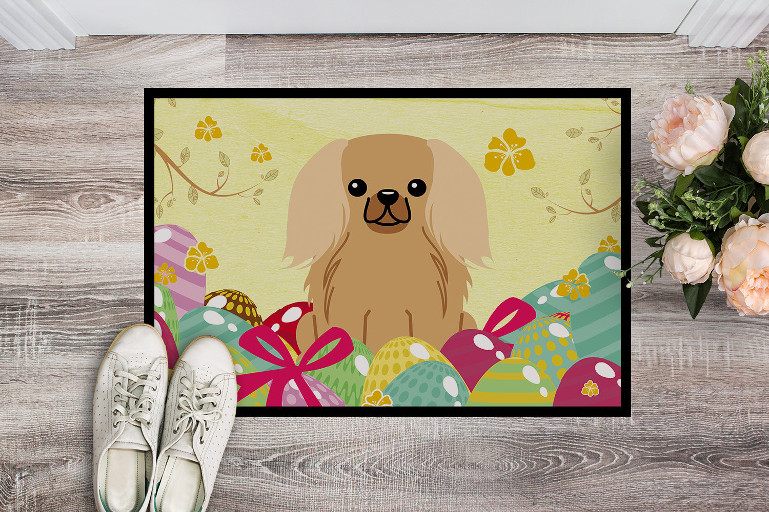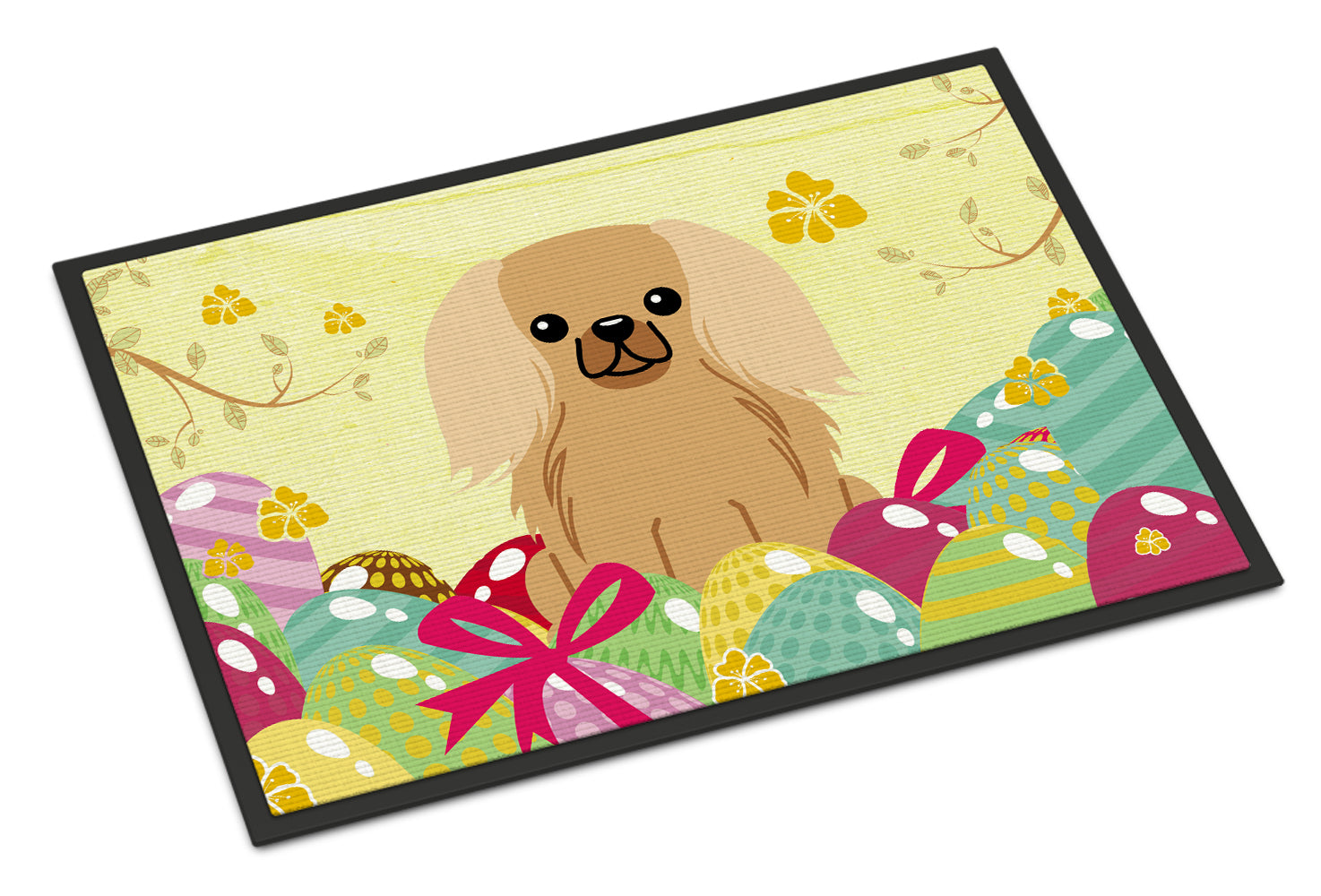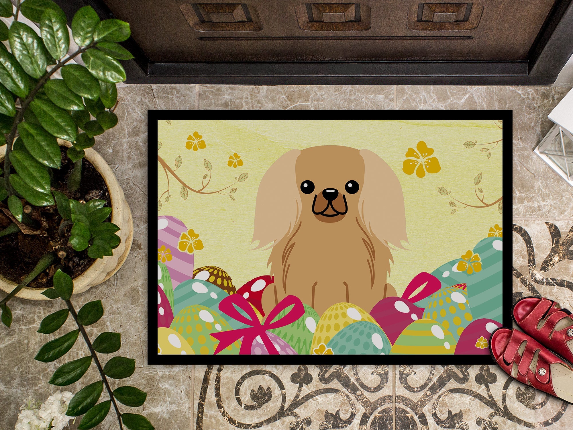 Decorate your space with our Easter Pekingese artwork on a Doormat. Welcome your guests in style with our Artwork Door Mat, designed to withstand almost any weather condition. This mat, measuring approximately 24 by 36 inches, is held together by durable black binding tape. Its top layer, composed of polyester felt, is dyed with the eye-catching image you see on the mat. A few layers below provide the mat with stability, while its rubber bottom is stamped to help prevent slipping and ensures safety. Our mat works wonderfully as both an indoor or outdoor door mat. For cleaning, simply hose it off with water or use a power washer - no need for any cleaner that produces suds. Avoid scrubbing with a brush, instead, opt for the vacuum on floor setting. Designed manufactured and printed in the USA, this mat is a perfect addition to your porch, outdoor kitchen, entryway, or any indoor space. Its unique design makes it a charming decorative rug that greets your guests and adds a stylish touch to your home decor.