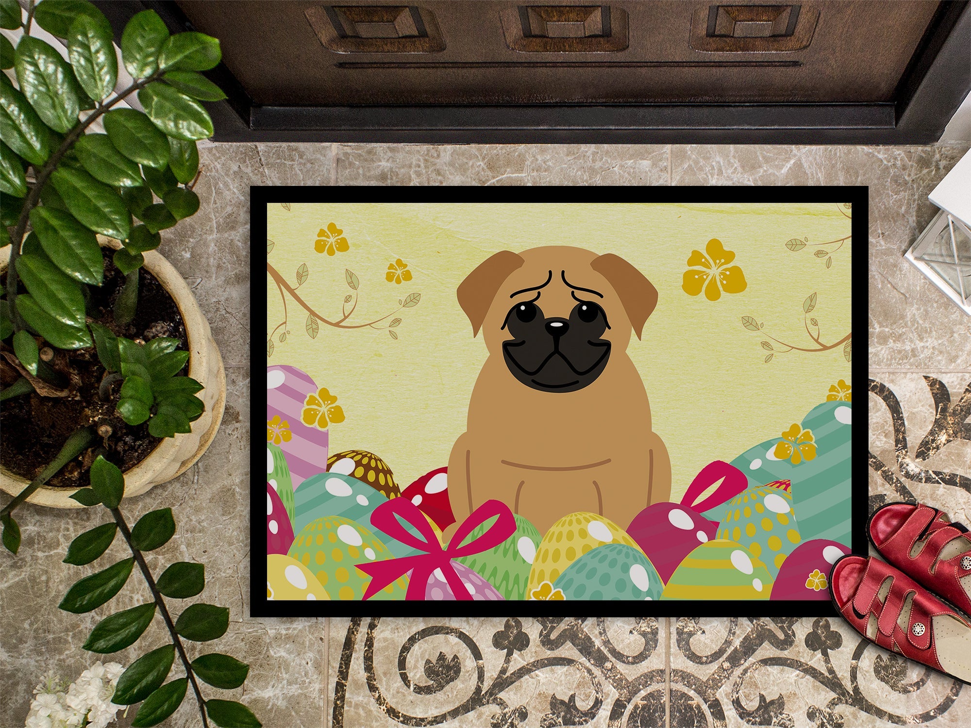 Decorate your space with our Easter Pug artwork on a Doormat. Welcome your guests in style with our Artwork Door Mat, designed to withstand almost any weather condition. This mat, measuring approximately 18 by 27 inches, is held together by durable black binding tape. Its top layer, composed of polyester felt, is dyed with the eye-catching image you see on the mat. A few layers below provide the mat with stability, while its rubber bottom is stamped to help prevent slipping and ensures safety. Our mat works wonderfully as both an indoor or outdoor door mat. For cleaning, simply hose it off with water or use a power washer - no need for any cleaner that produces suds. Avoid scrubbing with a brush, instead, opt for the vacuum on floor setting. Designed manufactured and printed in the USA, this mat is a perfect addition to your porch, outdoor kitchen, entryway, or any indoor space. Its unique design makes it a charming decorative rug that greets your guests and adds a stylish touch to your home decor.