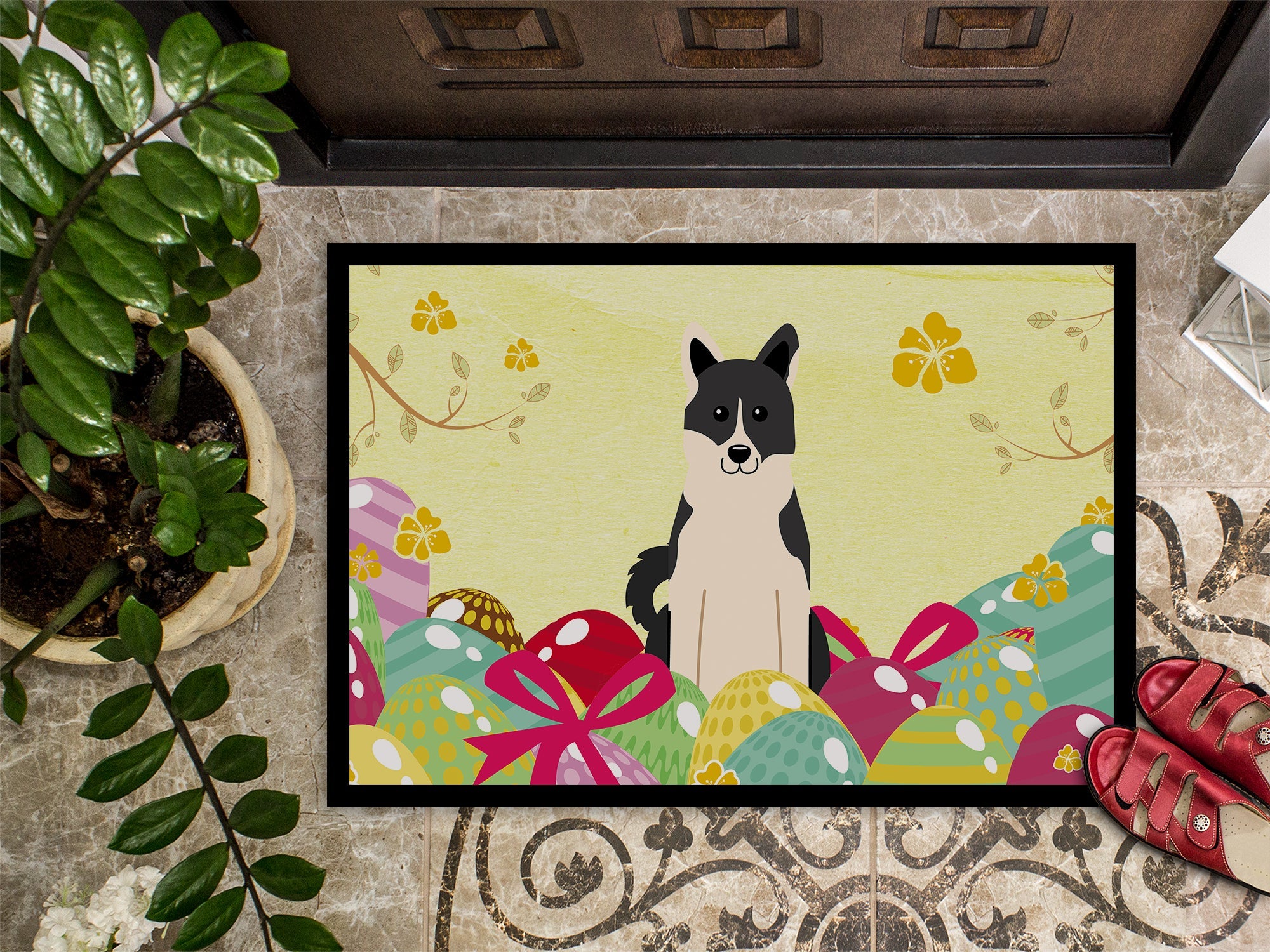 Decorate your space with our Easter Russo-European Laika Spitz artwork on a Doormat. Welcome your guests in style with our Artwork Door Mat, designed to withstand almost any weather condition. This mat, measuring approximately 18 by 27 inches, is held together by durable black binding tape. Its top layer, composed of polyester felt, is dyed with the eye-catching image you see on the mat. A few layers below provide the mat with stability, while its rubber bottom is stamped to help prevent slipping and ensures safety. Our mat works wonderfully as both an indoor or outdoor door mat. For cleaning, simply hose it off with water or use a power washer - no need for any cleaner that produces suds. Avoid scrubbing with a brush, instead, opt for the vacuum on floor setting. Designed manufactured and printed in the USA, this mat is a perfect addition to your porch, outdoor kitchen, entryway, or any indoor space. Its unique design makes it a charming decorative rug that greets your guests and adds a stylish touch to your home decor.