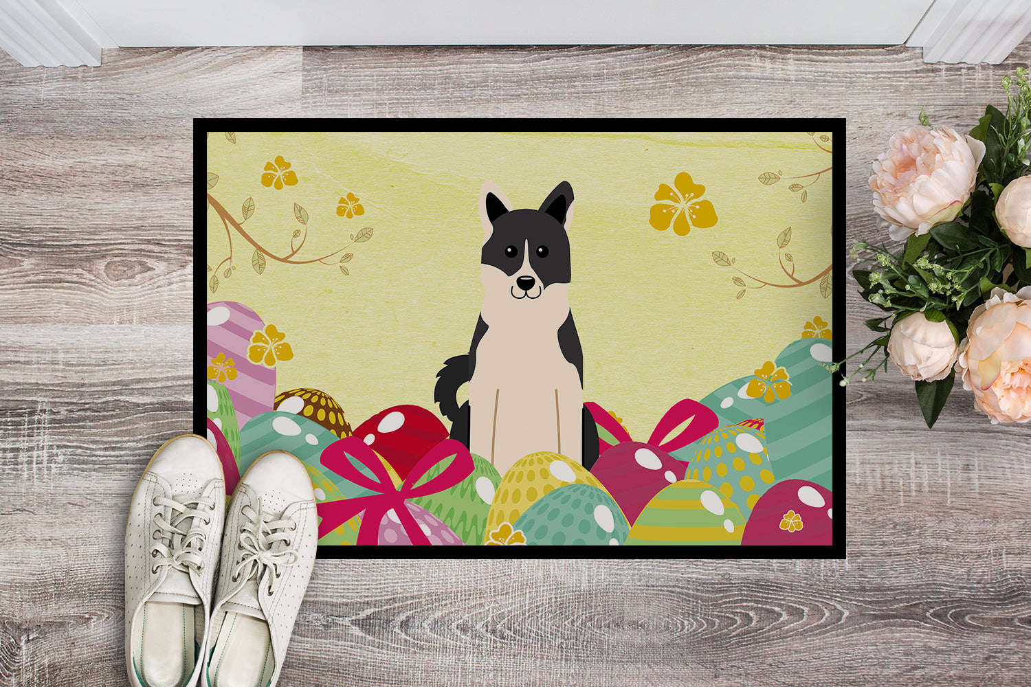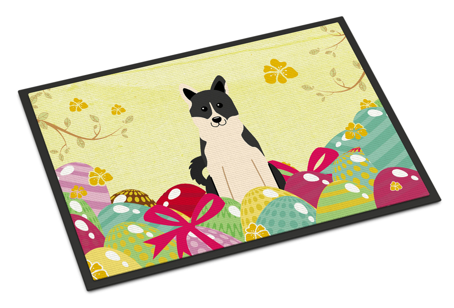 Decorate your space with our Easter Russo-European Laika Spitz artwork on a Doormat. Welcome your guests in style with our Artwork Door Mat, designed to withstand almost any weather condition. This mat, measuring approximately 24 by 36 inches, is held together by durable black binding tape. Its top layer, composed of polyester felt, is dyed with the eye-catching image you see on the mat. A few layers below provide the mat with stability, while its rubber bottom is stamped to help prevent slipping and ensures safety. Our mat works wonderfully as both an indoor or outdoor door mat. For cleaning, simply hose it off with water or use a power washer - no need for any cleaner that produces suds. Avoid scrubbing with a brush, instead, opt for the vacuum on floor setting. Designed manufactured and printed in the USA, this mat is a perfect addition to your porch, outdoor kitchen, entryway, or any indoor space. Its unique design makes it a charming decorative rug that greets your guests and adds a stylish touch to your home decor.