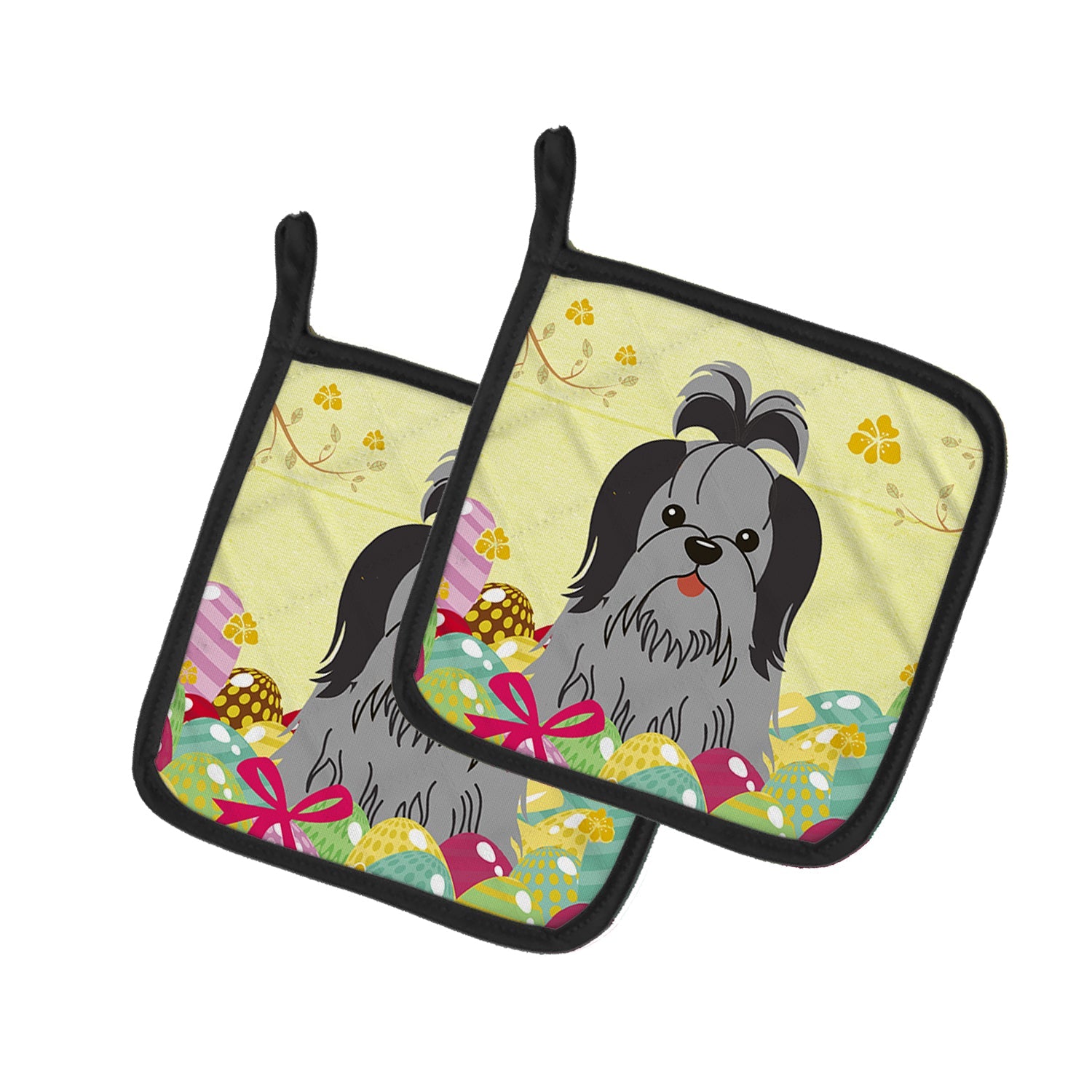 Decorate your space with our Easter Shih Tzu artwork on a Pair of Pot Holders. A Pair of Pot Holders to match your kitchen decor. Made in the USA these are thick and functional. Full color artwork decorates the front polyester fabric of the hot pad and accented by a black trim. Use these at as a trivet for your Thanksgiving or Christmas tablescape. Filled with insulated fabric and quilted for durability. These colorful pot holders will make a great gift for your favorite home cook or executive chef. Each pot holder measures approximately 7 1/2 inches by 7 1/2 inches. A hanging tab is included.