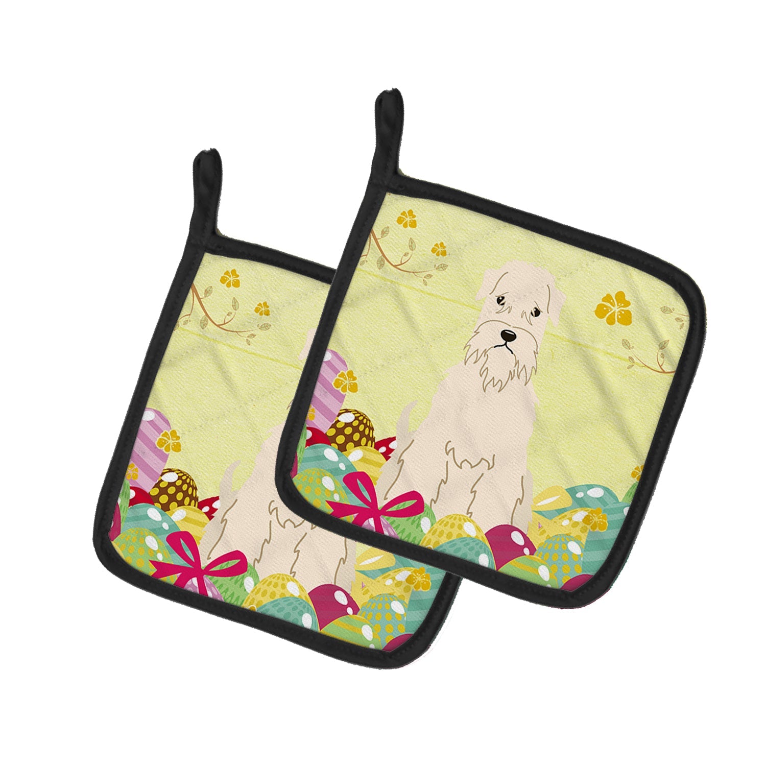 Decorate your space with our Easter Wheaten Terrier artwork on a Pair of Pot Holders. A Pair of Pot Holders to match your kitchen decor. Made in the USA these are thick and functional. Full color artwork decorates the front polyester fabric of the hot pad and accented by a black trim. Use these at as a trivet for your Thanksgiving or Christmas tablescape. Filled with insulated fabric and quilted for durability. These colorful pot holders will make a great gift for your favorite home cook or executive chef. Each pot holder measures approximately 7 1/2 inches by 7 1/2 inches. A hanging tab is included.