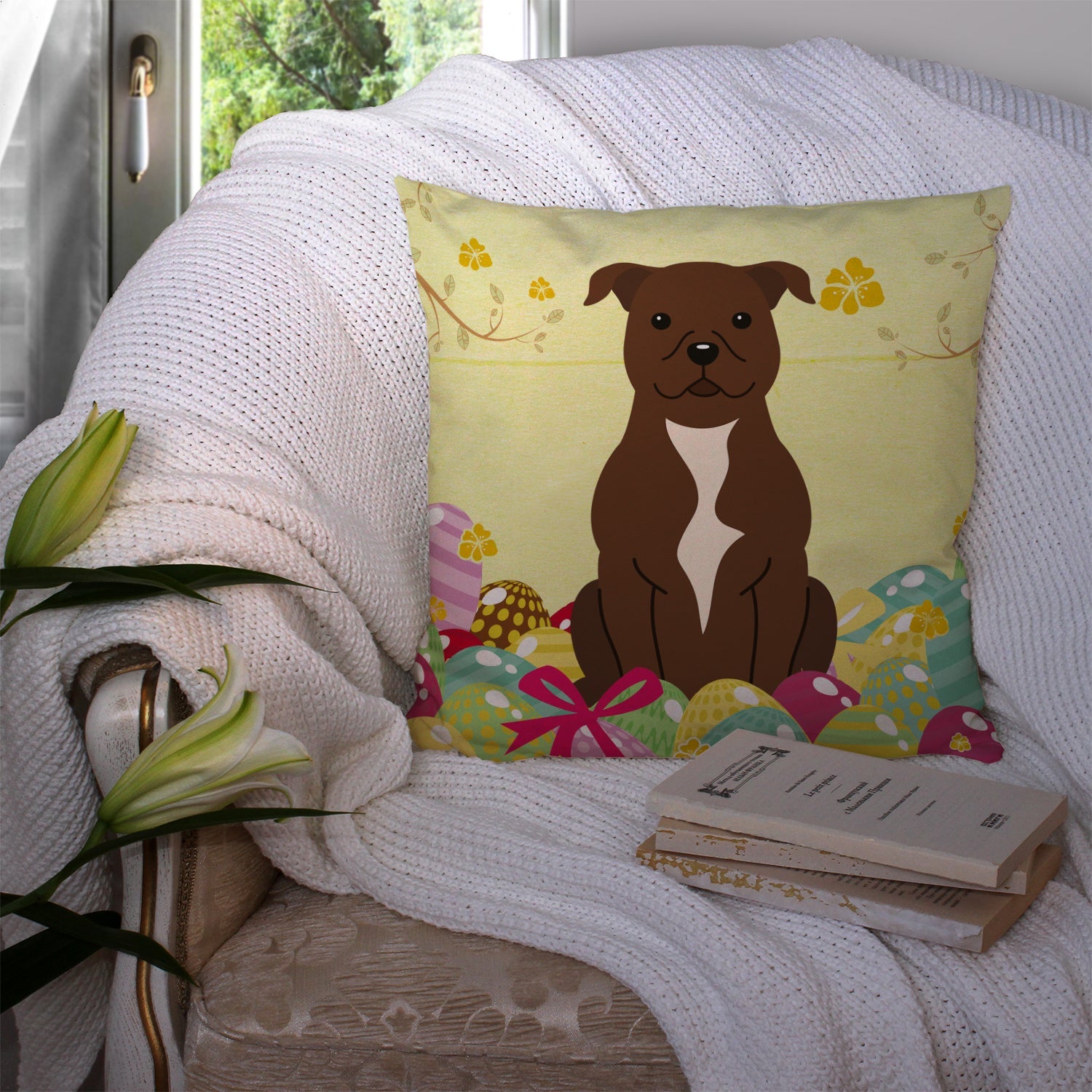 Decorate your space with our Easter Staffordshire Bull Terrier artwork on a Pillow. Add a touch of vibrancy and comfort to your outdoor seating with Caroline's Treasures Fabric Decorative Pillow. Measuring approximately 14 inches by 14 inches, this outdoor pillow is crafted to elevate the appeal of your patio furniture, infusing it with vivid color and artistic flair. The pillow includes a 100% Polyester Fabric sham filled with a quality pillow form to provide superior comfort. Innovatively made from our brand new material, specifically woven for its water resistance, this pillow is designed for durability. The soft canvas fabric offers versatility in use, fit for your indoor couch or your outdoor patio, porch, or veranda. The fabric is dyed with colorfast dyes built for resilience against weather conditions, ensuring the pillow retains its beauty over time. Constructed by sewing three fabric pieces to create a sham, the polyester insert is then nestled inside to form the pillow, resulting in an overstuffed pillow that maintains its shape. Both the sham and the pillow insert are proudly made in the United States. As the pillows are handcrafted, there may be minor variations in size, further enhancing their unique charm. Experience comfort in style with Caroline's Treasures Fabric Decorative Pillow.