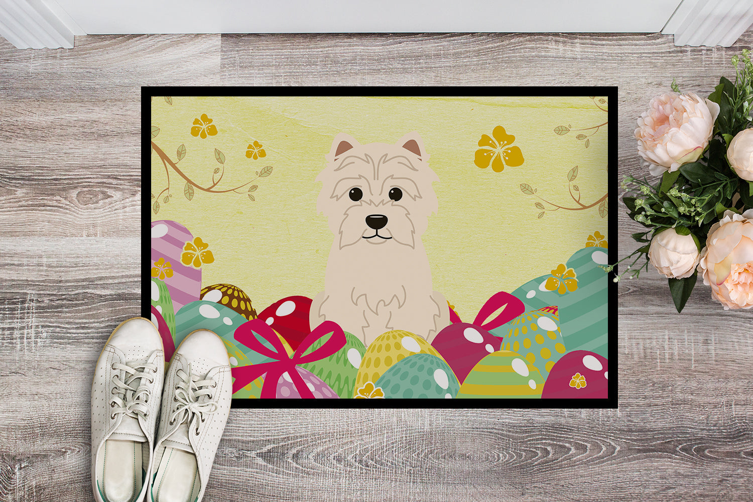 Decorate your space with our Easter West Highland White Terrier artwork on a Doormat. Welcome your guests in style with our Artwork Door Mat, designed to withstand almost any weather condition. This mat, measuring approximately 24 by 36 inches, is held together by durable black binding tape. Its top layer, composed of polyester felt, is dyed with the eye-catching image you see on the mat. A few layers below provide the mat with stability, while its rubber bottom is stamped to help prevent slipping and ensures safety. Our mat works wonderfully as both an indoor or outdoor door mat. For cleaning, simply hose it off with water or use a power washer - no need for any cleaner that produces suds. Avoid scrubbing with a brush, instead, opt for the vacuum on floor setting. Designed manufactured and printed in the USA, this mat is a perfect addition to your porch, outdoor kitchen, entryway, or any indoor space. Its unique design makes it a charming decorative rug that greets your guests and adds a stylish touch to your home decor.