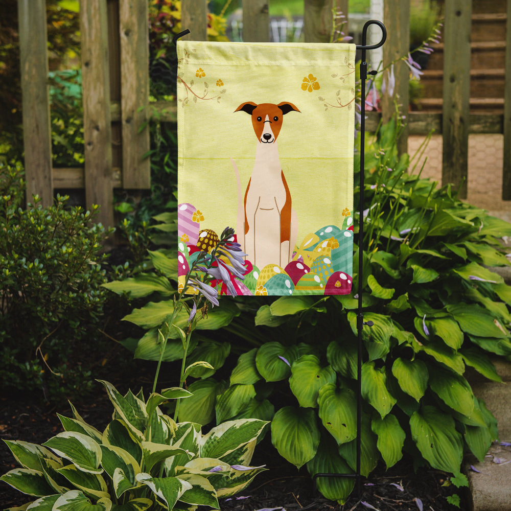 Decorate your space with our Easter Whippet artwork on a Garden Flag. Enhance the beauty of your garden, patio, or yard with Caroline's Treasures Decorative Garden Flag, proudly made in the USA. Crafted from two pieces of thick, double-sided polyester fabric, this 2-ply garden flag is designed to withstand various weather conditions, making it water-resistant and weatherproof. Featuring correctly readable words on both sides, this garden flag offers a delightful visual experience from any angle. With its heavier weight, it stands out among other garden flags, ensuring stability and durability even in wind, rain, and snow. Measuring approximately 11 1/4 inches by 15 1/2 inches, this flag allows you to personalize your outdoor decor. It comes with a 1 1/2-inch sleeve sewn in, allowing easy attachment to any standard garden flag stand or garden size porch hanger (sold separately). Make a statement in your outdoor space with Caroline's Treasures Decorative Garden Flag, a vibrant and high-quality flag that adds color and personality to your surroundings. Proudly made in the USA, it's a symbol of quality craftsmanship and attention to detail.