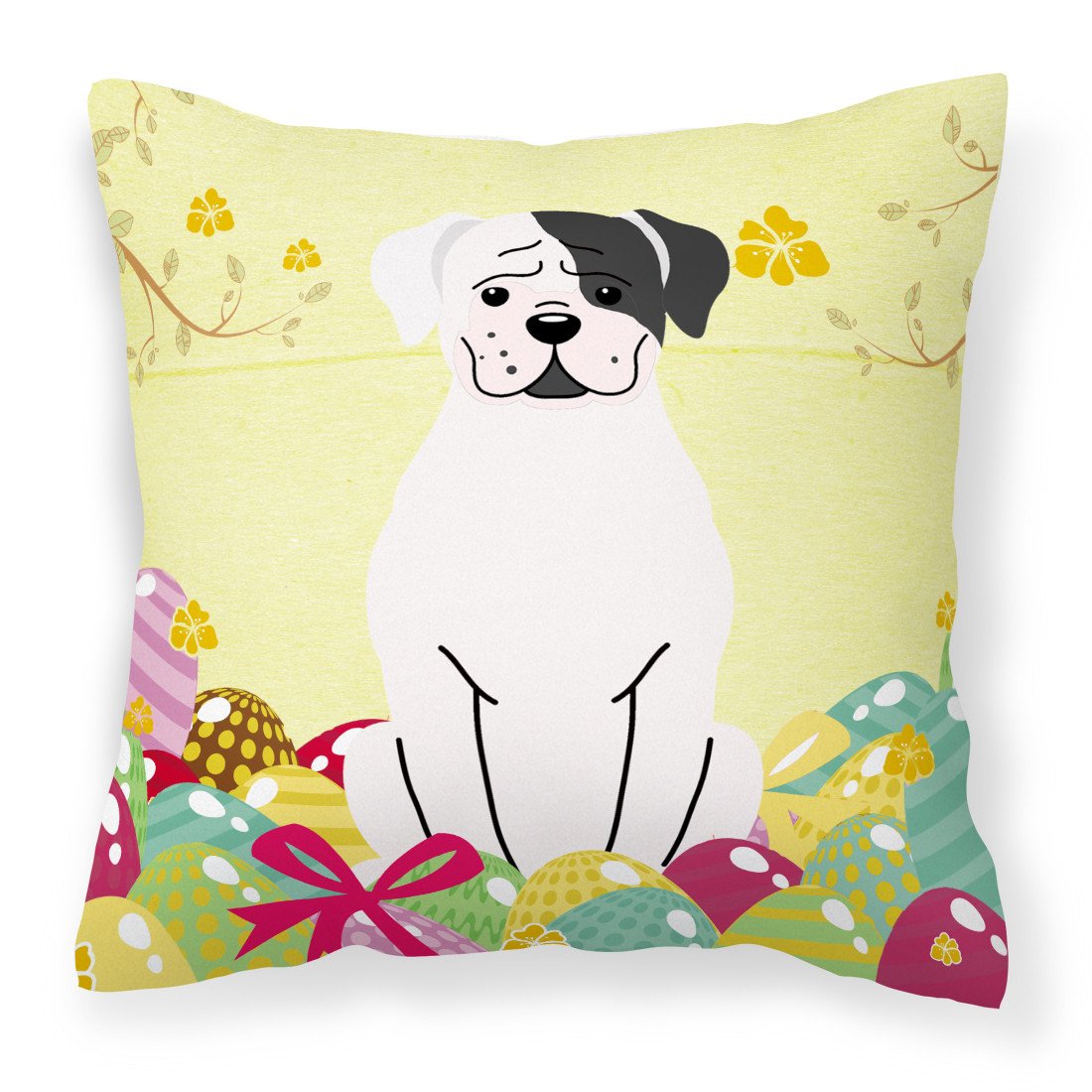 Decorate your space with our Easter Boxer artwork on a Pillow. Revitalize your outdoor or indoor living space with Caroline's Treasures 18x18 Fabric Decorative Pillow. With a generously sized dimension of approximately 18 inches by 18 inches, this pillow makes a comfortable and aesthetic addition to any seating area. Made from a unique, water-resistant material developed by Caroline's Treasures, the pillow sham is 100% polyester fabric that's durable and ready to weather any condition. Its vibrant, full-color artwork will not fade over time as it is dyed with color-fast dyes. Whether you place it on your patio furniture, porch, veranda, or indoor couch, its soft canvas fabric ensures a cozy experience. The pillow is handcrafted in the United States, featuring a sham created from three pieces of fabric and a polyester insert for enduring shape and overstuffed comfort. Despite being robustly built to endure the outdoors, it is as soft and snug as your favorite indoor cushions. Please note, as all our pillows are handmade, sizes may vary slightly, adding to the charm of this unique decorative item.