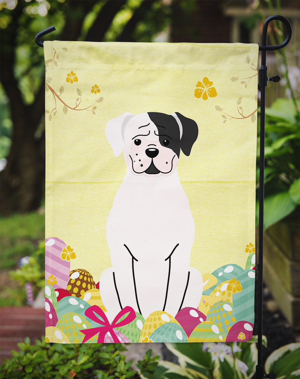 Decorate your space with our Easter Boxer artwork on a Garden Flag. Enhance the beauty of your garden, patio, or yard with Caroline's Treasures Decorative Garden Flag, proudly made in the USA. Crafted from two pieces of thick, double-sided polyester fabric, this 2-ply garden flag is designed to withstand various weather conditions, making it water-resistant and weatherproof. Featuring correctly readable words on both sides, this garden flag offers a delightful visual experience from any angle. With its heavier weight, it stands out among other garden flags, ensuring stability and durability even in wind, rain, and snow. Measuring approximately 11 1/4 inches by 15 1/2 inches, this flag allows you to personalize your outdoor decor. It comes with a 1 1/2-inch sleeve sewn in, allowing easy attachment to any standard garden flag stand or garden size porch hanger (sold separately). Make a statement in your outdoor space with Caroline's Treasures Decorative Garden Flag, a vibrant and high-quality flag that adds color and personality to your surroundings. Proudly made in the USA, it's a symbol of quality craftsmanship and attention to detail.