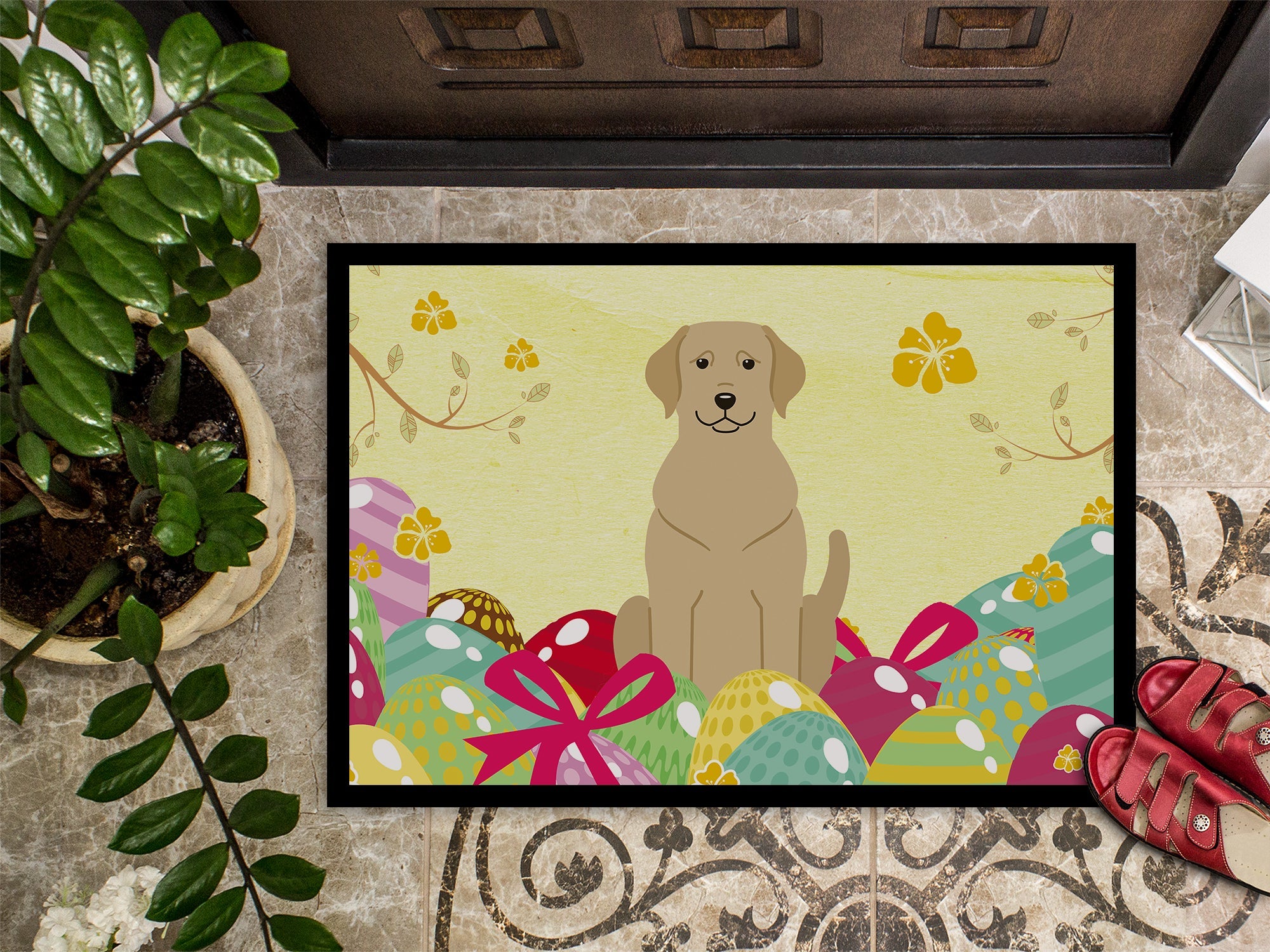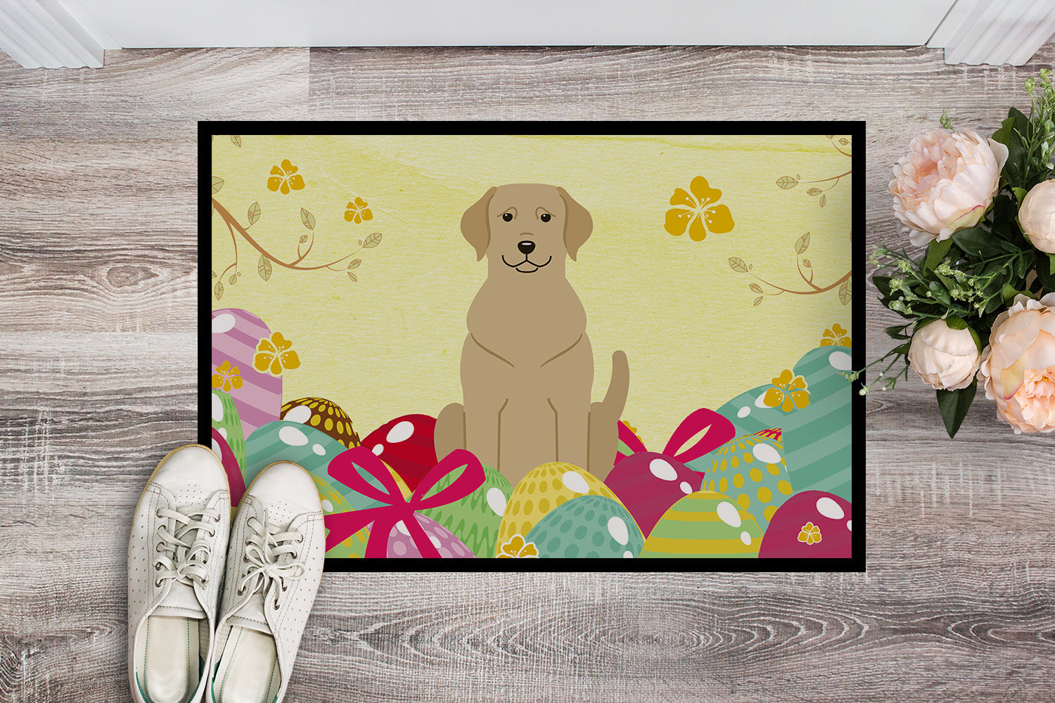 Decorate your space with our Easter Labrador Retriever artwork on a Doormat. Welcome your guests in style with our Artwork Door Mat, designed to withstand almost any weather condition. This mat, measuring approximately 18 by 27 inches, is held together by durable black binding tape. Its top layer, composed of polyester felt, is dyed with the eye-catching image you see on the mat. A few layers below provide the mat with stability, while its rubber bottom is stamped to help prevent slipping and ensures safety. Our mat works wonderfully as both an indoor or outdoor door mat. For cleaning, simply hose it off with water or use a power washer - no need for any cleaner that produces suds. Avoid scrubbing with a brush, instead, opt for the vacuum on floor setting. Designed manufactured and printed in the USA, this mat is a perfect addition to your porch, outdoor kitchen, entryway, or any indoor space. Its unique design makes it a charming decorative rug that greets your guests and adds a stylish touch to your home decor.