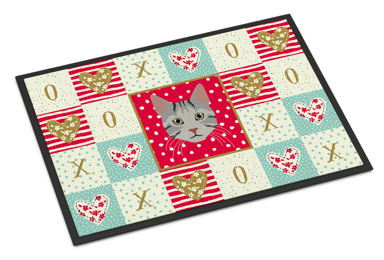 Decorate your space with our Valentine's Day Egyptian Mau artwork on a Doormat. Welcome your guests in style with our Artwork Door Mat, designed to withstand almost any weather condition. This mat, measuring approximately 18 by 27 inches, is held together by durable black binding tape. Its top layer, composed of polyester felt, is dyed with the eye-catching image you see on the mat. A few layers below provide the mat with stability, while its rubber bottom is stamped to help prevent slipping and ensures safety. Our mat works wonderfully as both an indoor or outdoor door mat. For cleaning, simply hose it off with water or use a power washer - no need for any cleaner that produces suds. Avoid scrubbing with a brush, instead, opt for the vacuum on floor setting. Designed manufactured and printed in the USA, this mat is a perfect addition to your porch, outdoor kitchen, entryway, or any indoor space. Its unique design makes it a charming decorative rug that greets your guests and adds a stylish touch to your home decor.