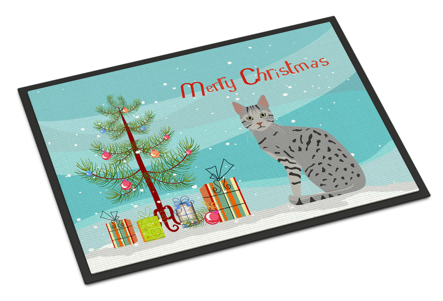 Decorate your space with our Christmas Egyptian Mau artwork on a Doormat. Welcome your guests in style with our Artwork Door Mat, designed to withstand almost any weather condition. This mat, measuring approximately 18 by 27 inches, is held together by durable black binding tape. Its top layer, composed of polyester felt, is dyed with the eye-catching image you see on the mat. A few layers below provide the mat with stability, while its rubber bottom is stamped to help prevent slipping and ensures safety. Our mat works wonderfully as both an indoor or outdoor door mat. For cleaning, simply hose it off with water or use a power washer - no need for any cleaner that produces suds. Avoid scrubbing with a brush, instead, opt for the vacuum on floor setting. Designed manufactured and printed in the USA, this mat is a perfect addition to your porch, outdoor kitchen, entryway, or any indoor space. Its unique design makes it a charming decorative rug that greets your guests and adds a stylish touch to your home decor.