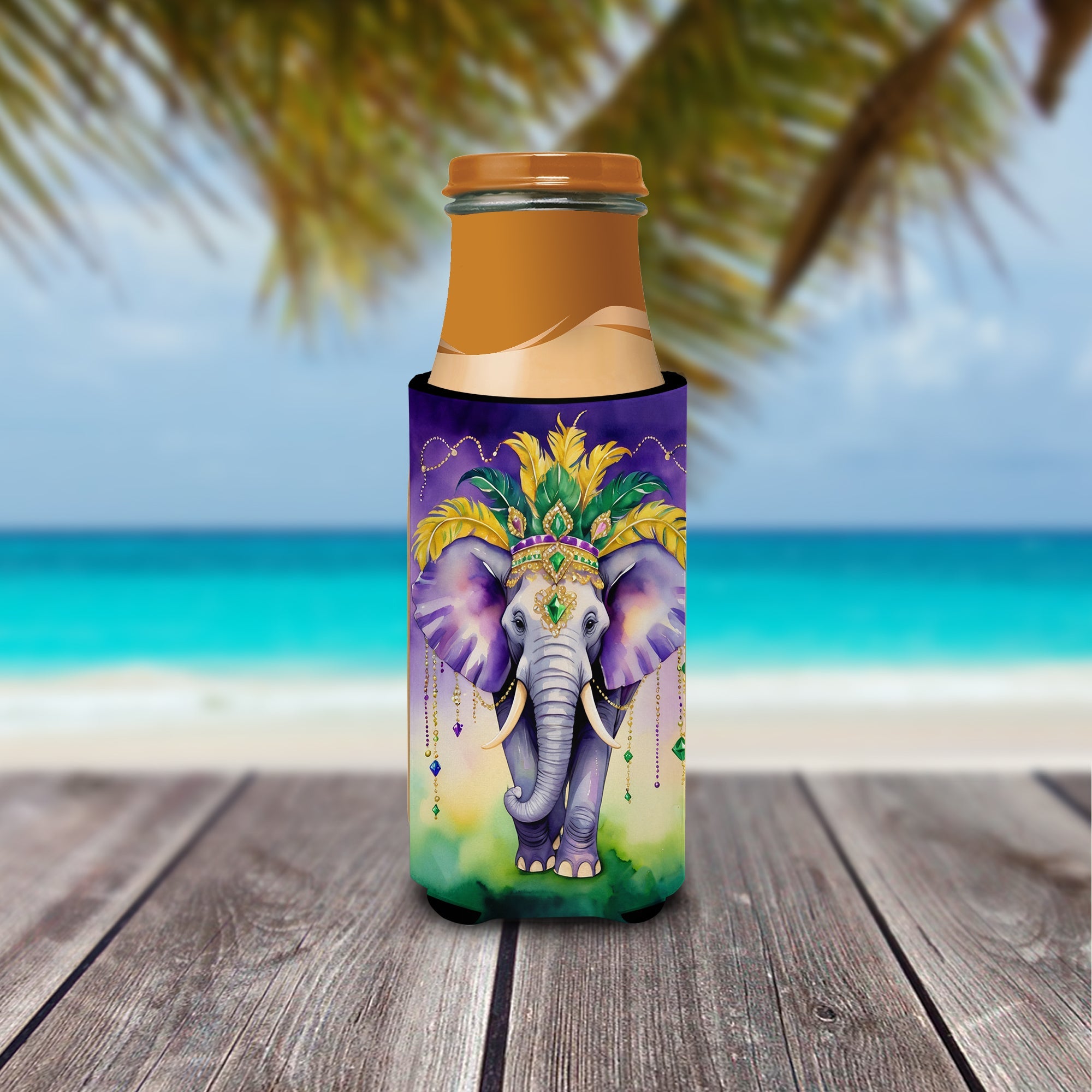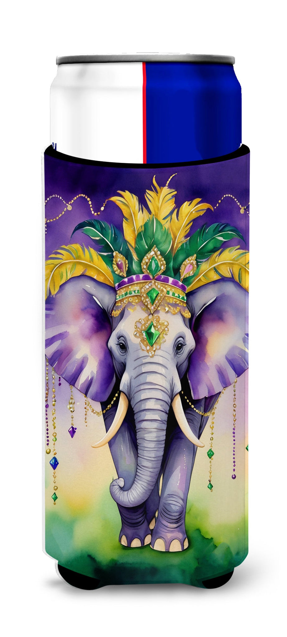 Decorate your space with our Mardi Gras artwork on a Slim Can Hugger. Elevate your beverage experience with our Slim Can Huggers, uniquely designed to fit a variety of your favorite 12 oz slim cans. Perfectly suited for Michelob Ultra, Starbucks Refreshers, Heineken Light, Bud Lite Lime, Dry Soda, Coors, Resin, Vitaminwater Energy, and Perrier Cans, our huggers ensure your drink stays refreshingly cool. The feature that sets our can huggers apart is the striking full-color artwork, exclusively created by one of our talented artists. It adds a touch of individuality and style to your drink, making it easier to identify in a crowd. A unique blend of practicality and flair, these huggers are an absolute must-have at any gathering. Our can huggers are not just beautiful but also incredibly durable. The design won't fade or peel off, and they can be safely cleaned in a washing machine. These collapsible beverage insulators are easy to store and transport, making them perfect for all occasions. Enjoy your drinks in style and comfort with our exceptional Slim Can Huggers.