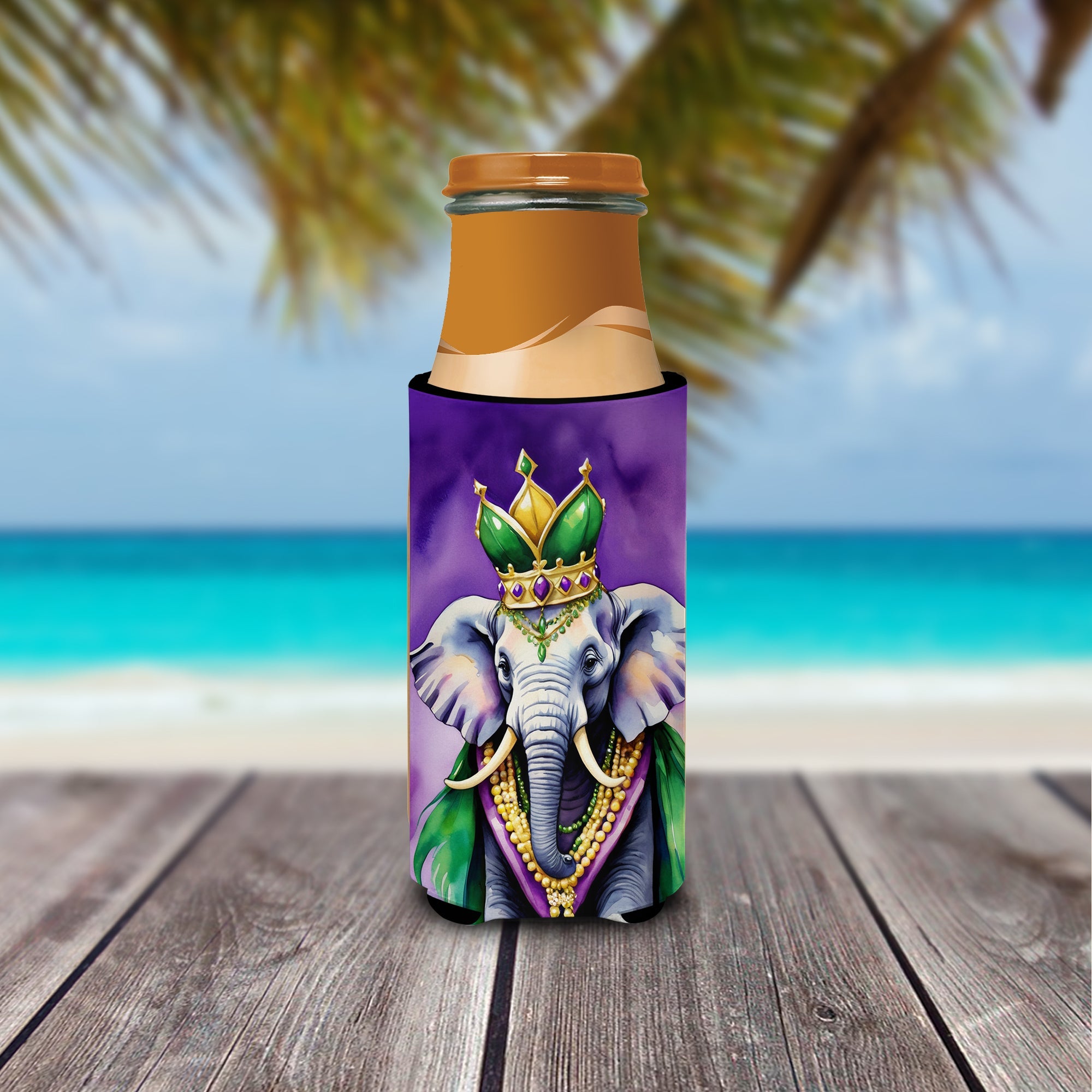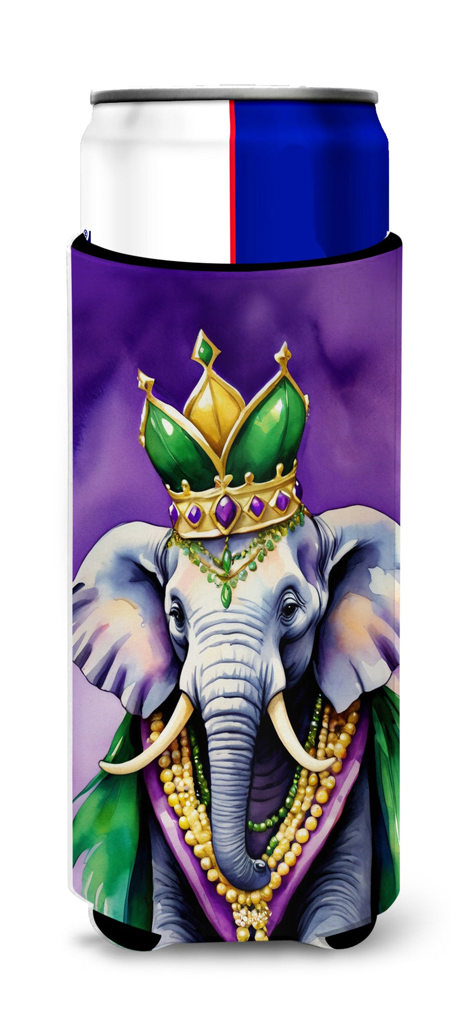 Decorate your space with our Mardi Gras artwork on a Slim Can Hugger. Elevate your beverage experience with our Slim Can Huggers, uniquely designed to fit a variety of your favorite 12 oz slim cans. Perfectly suited for Michelob Ultra, Starbucks Refreshers, Heineken Light, Bud Lite Lime, Dry Soda, Coors, Resin, Vitaminwater Energy, and Perrier Cans, our huggers ensure your drink stays refreshingly cool. The feature that sets our can huggers apart is the striking full-color artwork, exclusively created by one of our talented artists. It adds a touch of individuality and style to your drink, making it easier to identify in a crowd. A unique blend of practicality and flair, these huggers are an absolute must-have at any gathering. Our can huggers are not just beautiful but also incredibly durable. The design won't fade or peel off, and they can be safely cleaned in a washing machine. These collapsible beverage insulators are easy to store and transport, making them perfect for all occasions. Enjoy your drinks in style and comfort with our exceptional Slim Can Huggers.