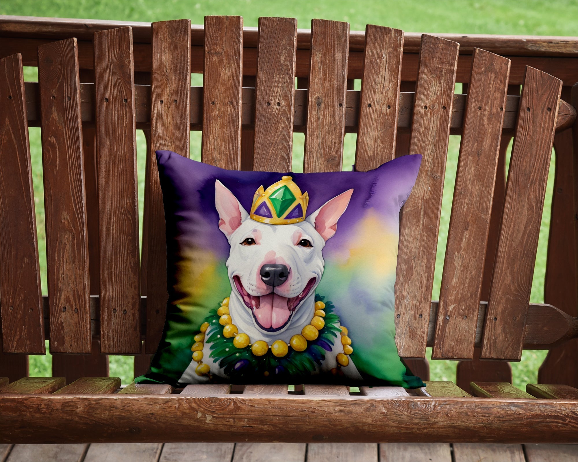 Throw Pillow featuring breed specific English Bull Terrier artwork. Celebrate Mardi Gras with this Mardi Gras Pillow. Add a touch of vibrancy and comfort to your outdoor seating with Caroline's Treasures Fabric Decorative Pillow. Measuring approximately 14 inches by 14 inches, this outdoor pillow is crafted to elevate the appeal of your patio furniture, infusing it with vivid color and artistic flair. The pillow includes a 100% Polyester Fabric sham filled with a quality pillow form to provide superior comfort. Innovatively made from our brand new material, specifically woven for its water resistance, this pillow is designed for durability. The soft canvas fabric offers versatility in use, fit for your indoor couch or your outdoor patio, porch, or veranda. The fabric is dyed with colorfast dyes built for resilience against weather conditions, ensuring the pillow retains its beauty over time. Constructed by sewing three fabric pieces to create a sham, the polyester insert is then nestled inside to form the pillow, resulting in an overstuffed pillow that maintains its shape. Both the sham and the pillow insert are proudly made in the United States. As the pillows are handcrafted, there may be minor variations in size, further enhancing their unique charm. Experience comfort in style with Caroline's Treasures Fabric Decorative Pillow.