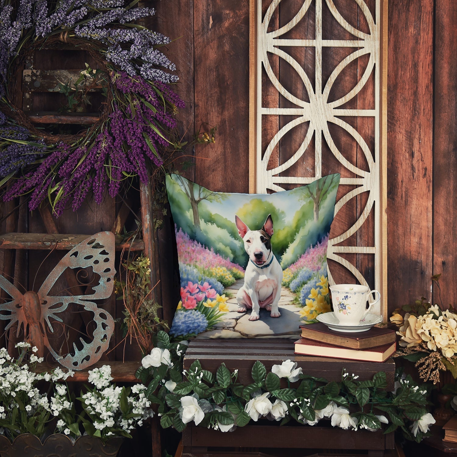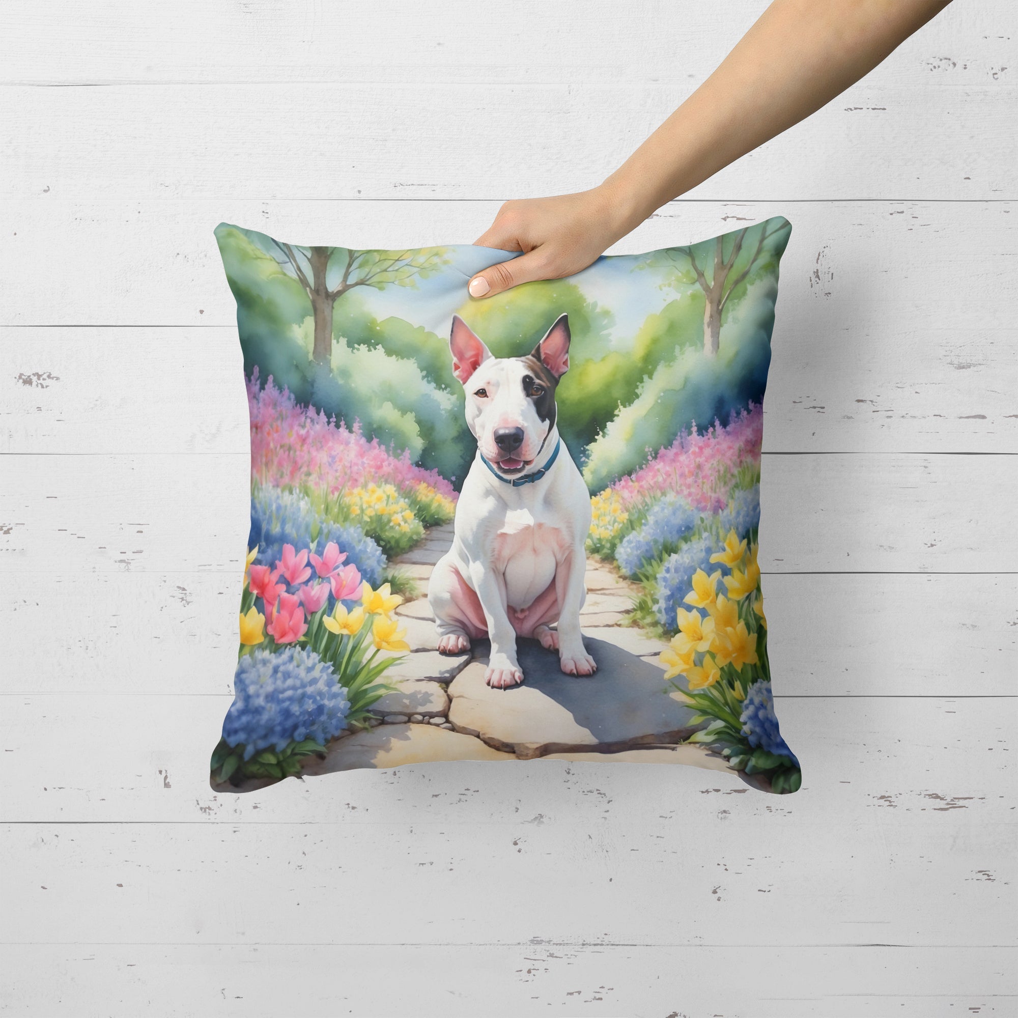 Decorate your space with our English Bull Terrier artwork on a Pillow. Bring a bit of Spring into your home with a Spring Pillow. Revitalize your outdoor or indoor living space with Caroline's Treasures 18x18 Fabric Decorative Pillow. With a generously sized dimension of approximately 18 inches by 18 inches, this pillow makes a comfortable and aesthetic addition to any seating area. Made from a unique, water-resistant material developed by Caroline's Treasures, the pillow sham is 100% polyester fabric that's durable and ready to weather any condition. Its vibrant, full-color artwork will not fade over time as it is dyed with color-fast dyes. Whether you place it on your patio furniture, porch, veranda, or indoor couch, its soft canvas fabric ensures a cozy experience. The pillow is handcrafted in the United States, featuring a sham created from three pieces of fabric and a polyester insert for enduring shape and overstuffed comfort. Despite being robustly built to endure the outdoors, it is as soft and snug as your favorite indoor cushions. Please note, as all our pillows are handmade, sizes may vary slightly, adding to the charm of this unique decorative item.