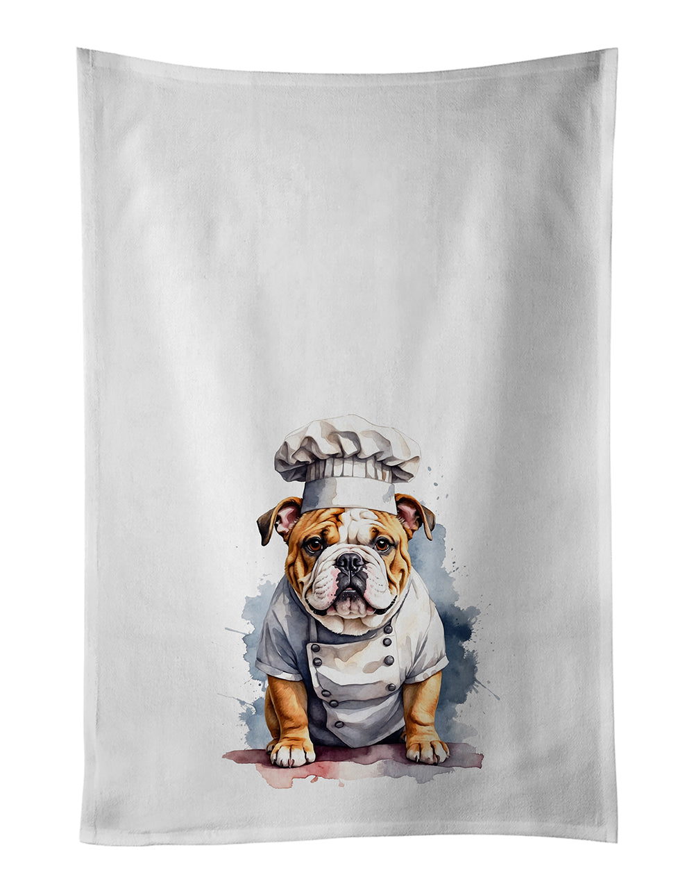 Kitchen Towel Set of 2 featuring breed specific English Bulldog artwork. Spruce up your kitchen decor with Caroline's Treasures Decorative White Kitchen Towel Set. This set of two dish towels showcases beautiful artwork from one of our talented artists, making them both practical and visually appealing. These towels are crafted from 100% cotton, offering excellent absorbency and durability, making them ideal for any kitchen task. Each white towel measures 19 inches by 28 inches, providing ample coverage for drying dishes or wiping up spills. The standout feature of these towels is the full-color artwork design printed on each one. They can serve as a vibrant accent in your kitchen, turning a functional item into a delightful piece of decor. When it comes to care, these towels are machine washable in cold water and can be dried on low heat. Remember to always use a pressing cloth when pressing the design, and avoid using bleach on the decorated towel. The Decorative White Kitchen Towel Set makes a great gift or a stylish addition to your own kitchen.