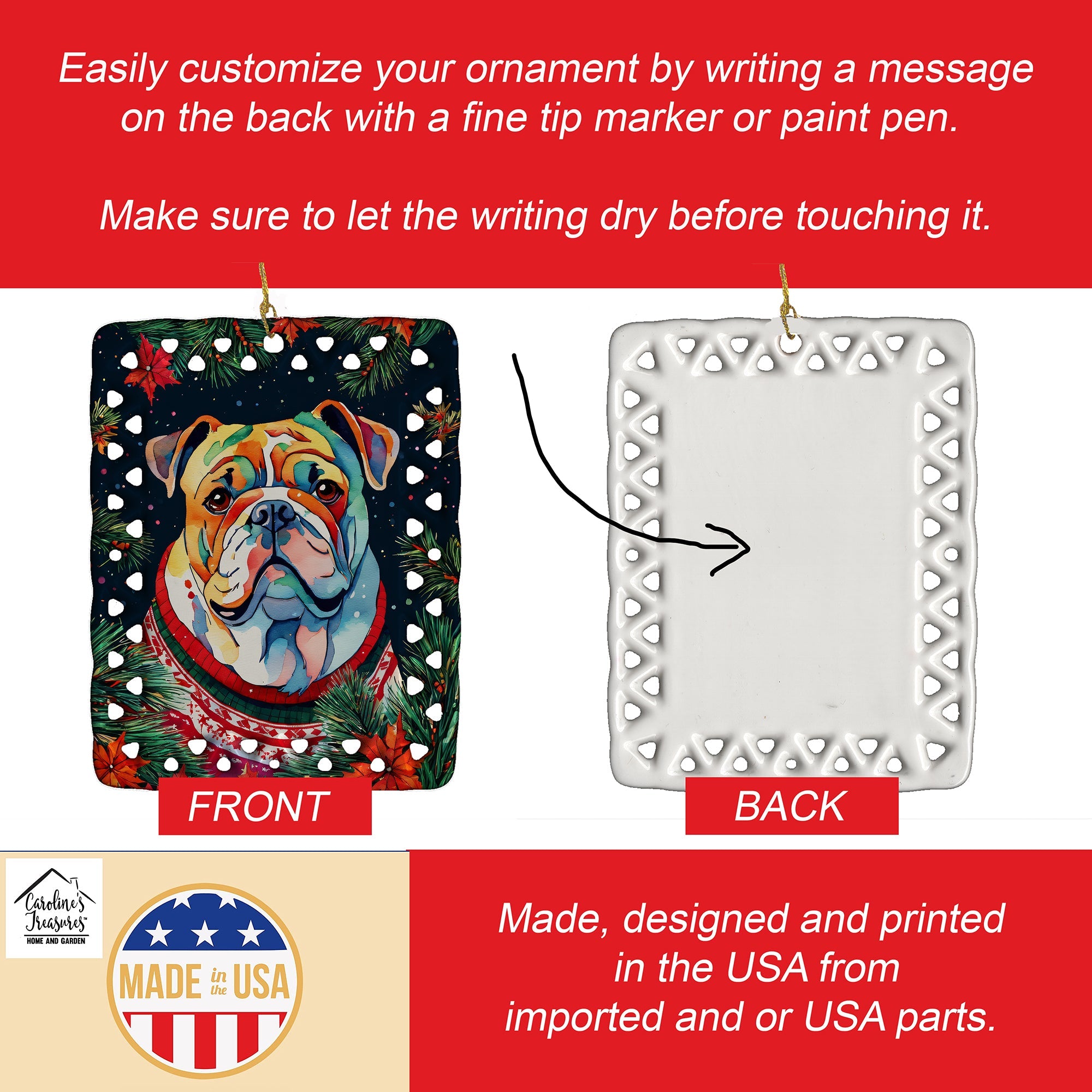 Porcelain Ornament featuring breed specific English Bulldog artwork. Celebrate Christmas with this Christmas Ornament. Add a unique, personal touch to your holiday decor with our Rectangular Lattice Porcelain Ornament. Perfect for creating cherished memories, this high-quality ornament shines under festive lights, reflecting warmth and joy throughout your Christmas tree. Crafted with a glossy finish, it showcases vibrant, full-color artwork contributed by our talented artists, ensuring your tree is adorned with a burst of color and holiday spirit. What sets this Porcelain Ornament apart is its customizable white back. Use a paint pen or permanent marker to write a heartfelt message, commemorate a special year, or mark an unforgettable date, turning this ornament into a keepsake that will be treasured for years to come. For best results, allow any personalization to dry thoroughly before handling. Each ornament comes complete with a delicate gold cord, making it easy to hang and display. Proudly made in the USA, this ornament measures 3.375 x 2.625 inches and is a thoughtful gift for pet sitters, teachers, family members, or anyone who would appreciate a little extra holiday magic. Bring style, charm, and a touch of personal meaning to your Christmas tree with this beautifully designed ornament..