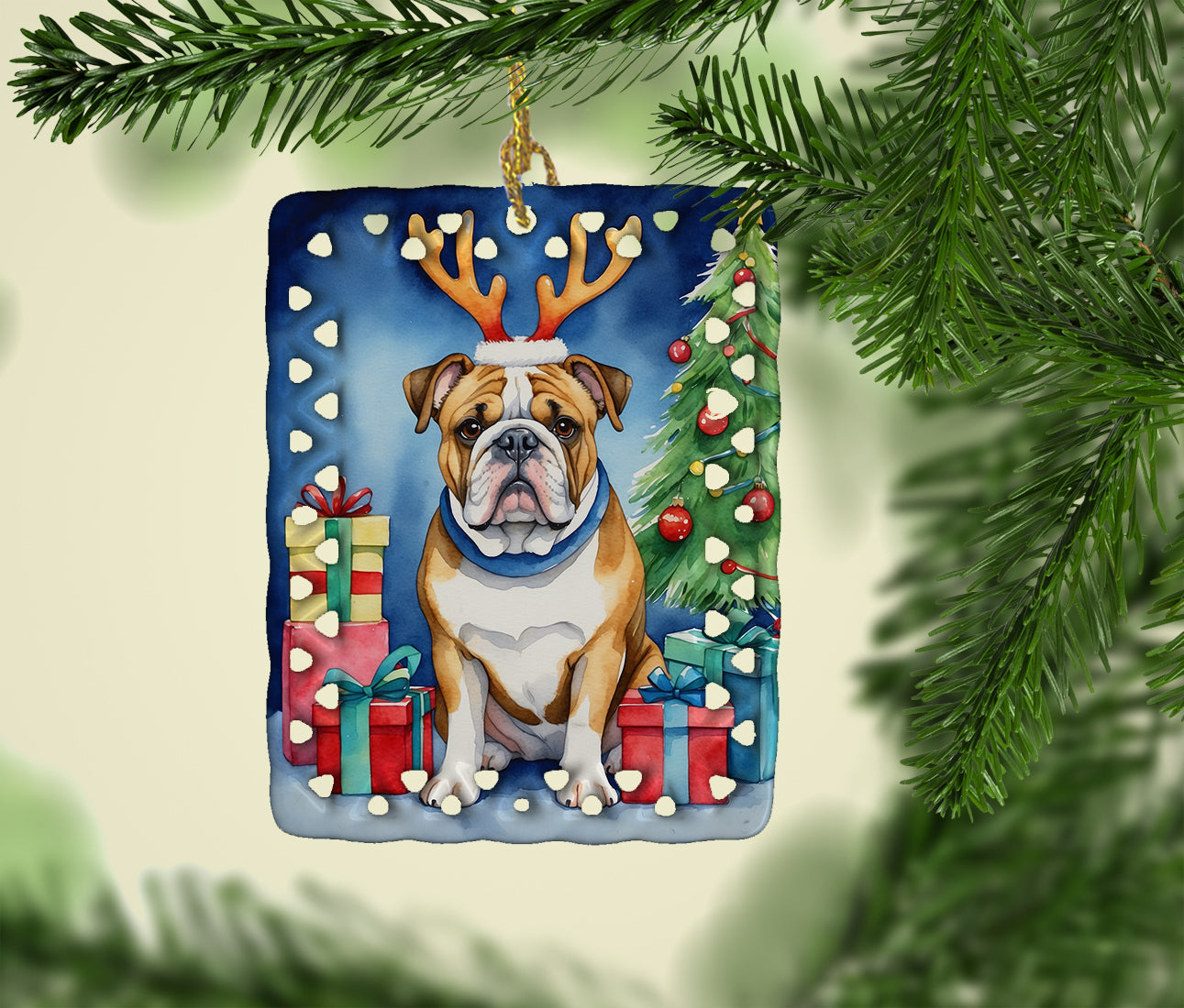 Porcelain Ornament featuring breed specific English Bulldog artwork. Celebrate Christmas with this Christmas Ornament. Add a unique, personal touch to your holiday decor with our Rectangular Lattice Porcelain Ornament. Perfect for creating cherished memories, this high-quality ornament shines under festive lights, reflecting warmth and joy throughout your Christmas tree. Crafted with a glossy finish, it showcases vibrant, full-color artwork contributed by our talented artists, ensuring your tree is adorned with a burst of color and holiday spirit. What sets this Porcelain Ornament apart is its customizable white back. Use a paint pen or permanent marker to write a heartfelt message, commemorate a special year, or mark an unforgettable date, turning this ornament into a keepsake that will be treasured for years to come. For best results, allow any personalization to dry thoroughly before handling. Each ornament comes complete with a delicate gold cord, making it easy to hang and display. Proudly made in the USA, this ornament measures 3.375 x 2.625 inches and is a thoughtful gift for pet sitters, teachers, family members, or anyone who would appreciate a little extra holiday magic. Bring style, charm, and a touch of personal meaning to your Christmas tree with this beautifully designed ornament..