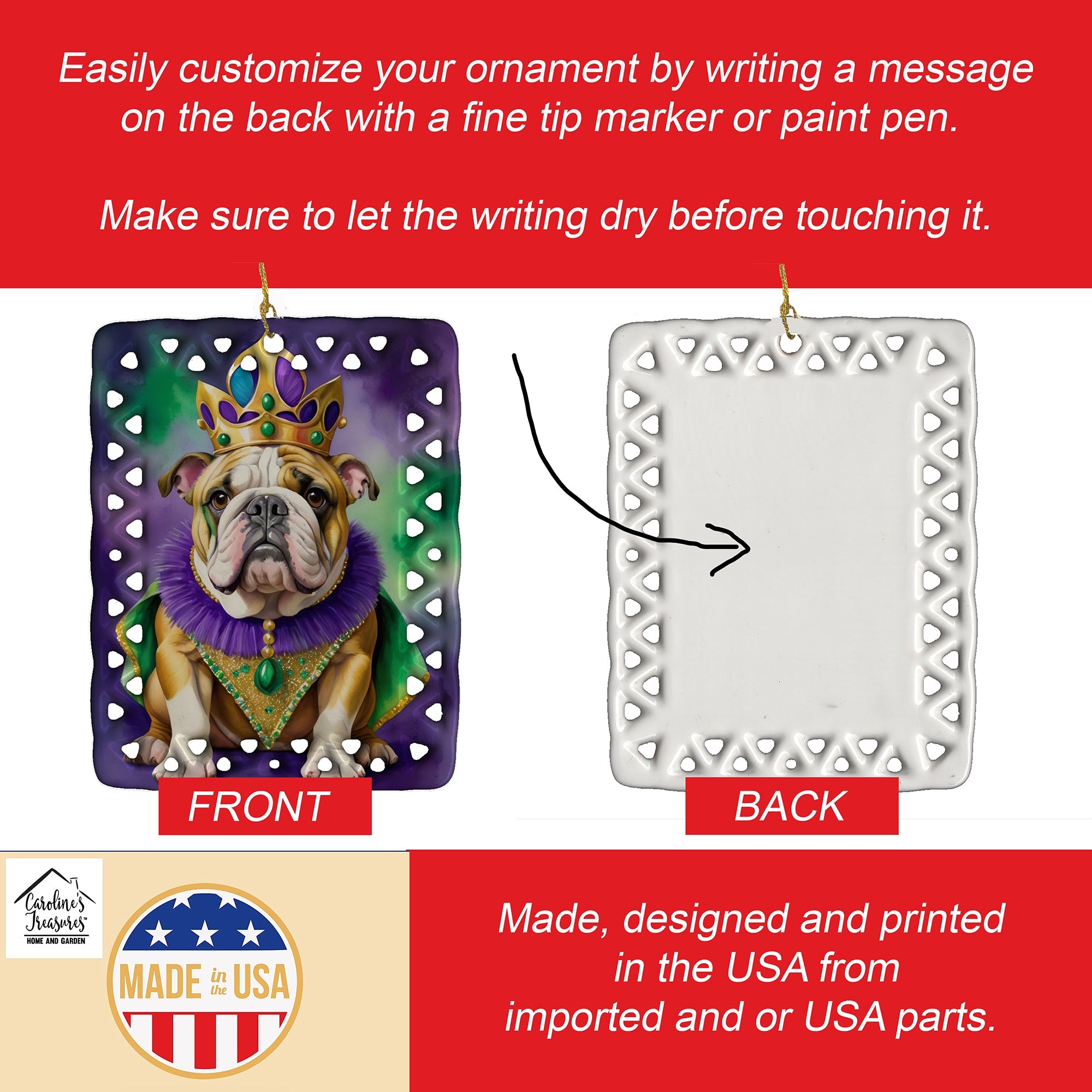 Porcelain Ornament featuring breed specific English Bulldog artwork. Celebrate Mardi Gras with this Mardi Gras Ornament. Add a unique, personal touch to your holiday decor with our Rectangular Lattice Porcelain Ornament. Perfect for creating cherished memories, this high-quality ornament shines under festive lights, reflecting warmth and joy throughout your Christmas tree. Crafted with a glossy finish, it showcases vibrant, full-color artwork contributed by our talented artists, ensuring your tree is adorned with a burst of color and holiday spirit. What sets this Porcelain Ornament apart is its customizable white back. Use a paint pen or permanent marker to write a heartfelt message, commemorate a special year, or mark an unforgettable date, turning this ornament into a keepsake that will be treasured for years to come. For best results, allow any personalization to dry thoroughly before handling. Each ornament comes complete with a delicate gold cord, making it easy to hang and display. Proudly made in the USA, this ornament measures 3.375 x 2.625 inches and is a thoughtful gift for pet sitters, teachers, family members, or anyone who would appreciate a little extra holiday magic. Bring style, charm, and a touch of personal meaning to your Christmas tree with this beautifully designed ornament..