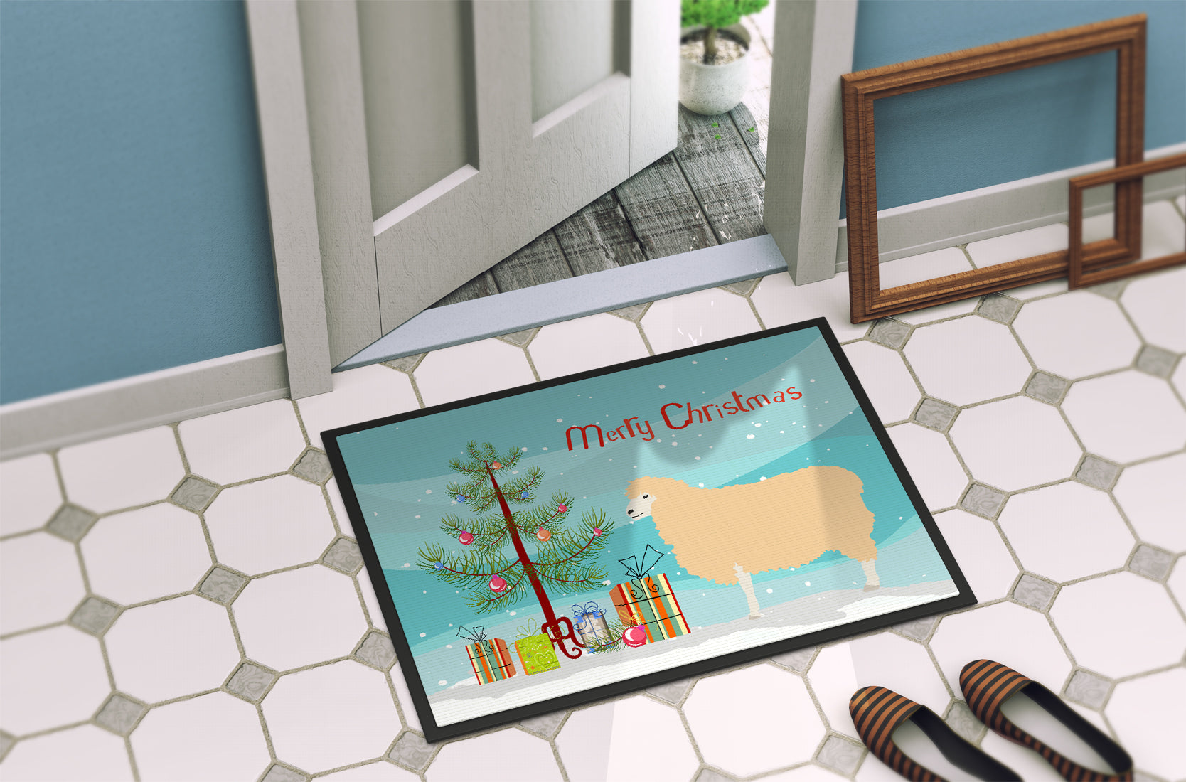Decorate your space with our Christmas English Leicester Longwool Sheep artwork on a Doormat. Welcome your guests in style with our Artwork Door Mat, designed to withstand almost any weather condition. This mat, measuring approximately 24 by 36 inches, is held together by durable black binding tape. Its top layer, composed of polyester felt, is dyed with the eye-catching image you see on the mat. A few layers below provide the mat with stability, while its rubber bottom is stamped to help prevent slipping and ensures safety. Our mat works wonderfully as both an indoor or outdoor door mat. For cleaning, simply hose it off with water or use a power washer - no need for any cleaner that produces suds. Avoid scrubbing with a brush, instead, opt for the vacuum on floor setting. Designed manufactured and printed in the USA, this mat is a perfect addition to your porch, outdoor kitchen, entryway, or any indoor space. Its unique design makes it a charming decorative rug that greets your guests and adds a stylish touch to your home decor.