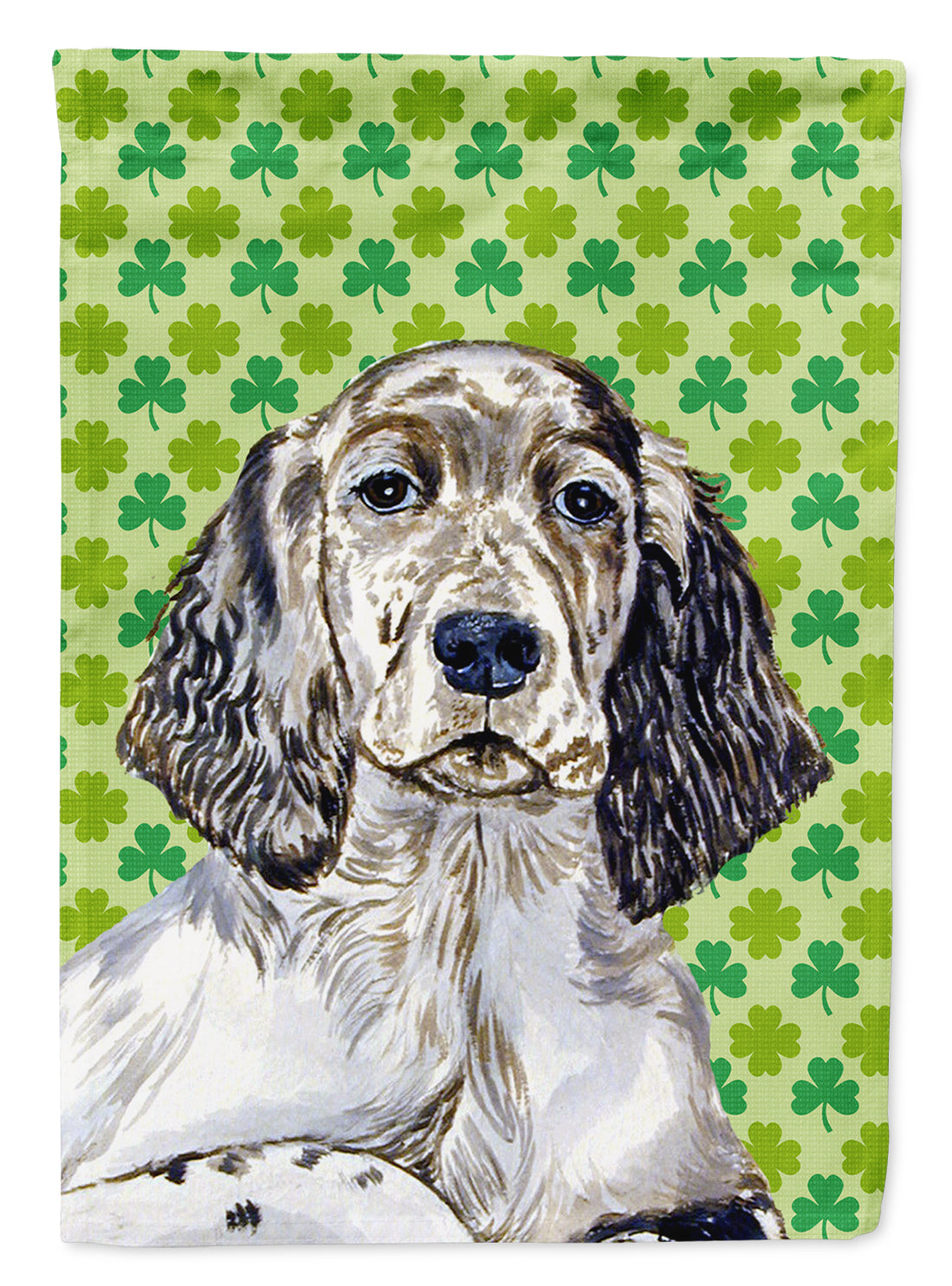 Decorate your space with our St Patrick's Day English Setter artwork on a Garden Flag. Enhance the beauty of your garden, patio, or yard with Caroline's Treasures Decorative Garden Flag, proudly made in the USA. Crafted from two pieces of thick, double-sided polyester fabric, this 2-ply garden flag is designed to withstand various weather conditions, making it water-resistant and weatherproof. Featuring correctly readable words on both sides, this garden flag offers a delightful visual experience from any angle. With its heavier weight, it stands out among other garden flags, ensuring stability and durability even in wind, rain, and snow. Measuring approximately 11 1/4 inches by 15 1/2 inches, this flag allows you to personalize your outdoor decor. It comes with a 1 1/2-inch sleeve sewn in, allowing easy attachment to any standard garden flag stand or garden size porch hanger (sold separately). Make a statement in your outdoor space with Caroline's Treasures Decorative Garden Flag, a vibrant and high-quality flag that adds color and personality to your surroundings. Proudly made in the USA, it's a symbol of quality craftsmanship and attention to detail.