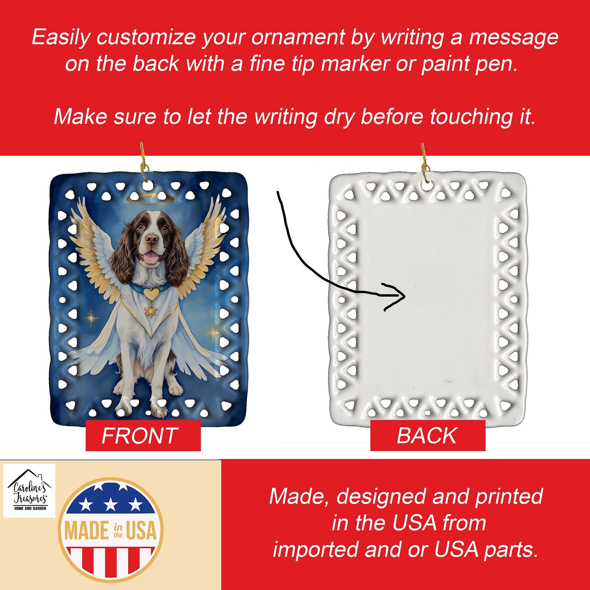 Porcelain Ornament featuring breed specific English Springer Spaniel artwork. Celebrate Christmas with this Christmas Ornament. Add a unique, personal touch to your holiday decor with our Rectangular Lattice Porcelain Ornament. Perfect for creating cherished memories, this high-quality ornament shines under festive lights, reflecting warmth and joy throughout your Christmas tree. Crafted with a glossy finish, it showcases vibrant, full-color artwork contributed by our talented artists, ensuring your tree is adorned with a burst of color and holiday spirit. What sets this Porcelain Ornament apart is its customizable white back. Use a paint pen or permanent marker to write a heartfelt message, commemorate a special year, or mark an unforgettable date, turning this ornament into a keepsake that will be treasured for years to come. For best results, allow any personalization to dry thoroughly before handling. Each ornament comes complete with a delicate gold cord, making it easy to hang and display. Proudly made in the USA, this ornament measures 3.375 x 2.625 inches and is a thoughtful gift for pet sitters, teachers, family members, or anyone who would appreciate a little extra holiday magic. Bring style, charm, and a touch of personal meaning to your Christmas tree with this beautifully designed ornament..
