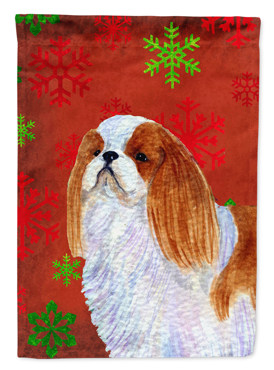 Decorate your space with our Christmas English Toy Spaniel artwork on a Garden Flag. Enhance the beauty of your garden, patio, or yard with Caroline's Treasures Decorative Garden Flag, proudly made in the USA. Crafted from two pieces of thick, double-sided polyester fabric, this 2-ply garden flag is designed to withstand various weather conditions, making it water-resistant and weatherproof. Featuring correctly readable words on both sides, this garden flag offers a delightful visual experience from any angle. With its heavier weight, it stands out among other garden flags, ensuring stability and durability even in wind, rain, and snow. Measuring approximately 11 1/4 inches by 15 1/2 inches, this flag allows you to personalize your outdoor decor. It comes with a 1 1/2-inch sleeve sewn in, allowing easy attachment to any standard garden flag stand or garden size porch hanger (sold separately). Make a statement in your outdoor space with Caroline's Treasures Decorative Garden Flag, a vibrant and high-quality flag that adds color and personality to your surroundings. Proudly made in the USA, it's a symbol of quality craftsmanship and attention to detail.