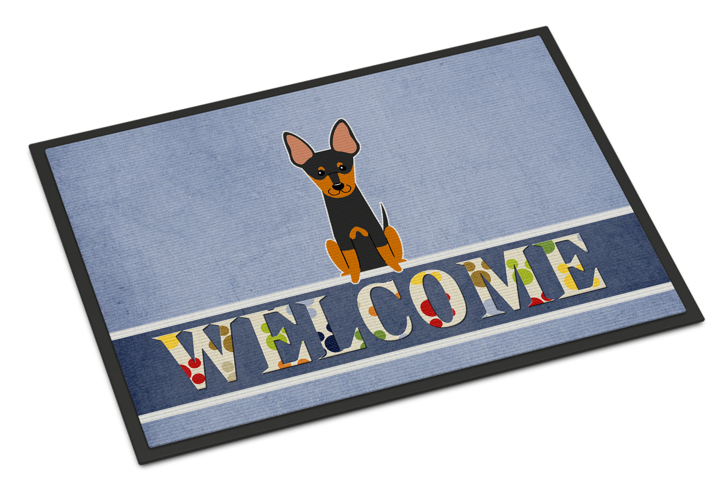 Decorate your space with our English Toy Terrier artwork on a Doormat. Welcome your guests in style with our Artwork Door Mat, designed to withstand almost any weather condition. This mat, measuring approximately 18 by 27 inches, is held together by durable black binding tape. Its top layer, composed of polyester felt, is dyed with the eye-catching image you see on the mat. A few layers below provide the mat with stability, while its rubber bottom is stamped to help prevent slipping and ensures safety. Our mat works wonderfully as both an indoor or outdoor door mat. For cleaning, simply hose it off with water or use a power washer - no need for any cleaner that produces suds. Avoid scrubbing with a brush, instead, opt for the vacuum on floor setting. Designed manufactured and printed in the USA, this mat is a perfect addition to your porch, outdoor kitchen, entryway, or any indoor space. Its unique design makes it a charming decorative rug that greets your guests and adds a stylish touch to your home decor.