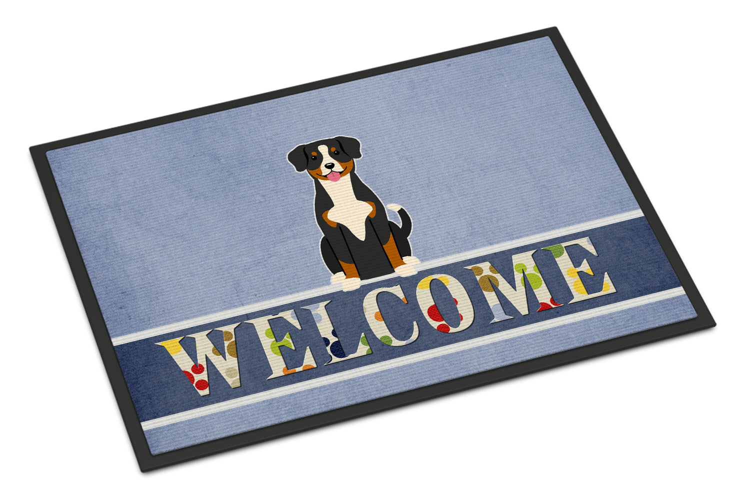 Decorate your space with our Entlebucher artwork on a Doormat. Welcome your guests in style with our Artwork Door Mat, designed to withstand almost any weather condition. This mat, measuring approximately 18 by 27 inches, is held together by durable black binding tape. Its top layer, composed of polyester felt, is dyed with the eye-catching image you see on the mat. A few layers below provide the mat with stability, while its rubber bottom is stamped to help prevent slipping and ensures safety. Our mat works wonderfully as both an indoor or outdoor door mat. For cleaning, simply hose it off with water or use a power washer - no need for any cleaner that produces suds. Avoid scrubbing with a brush, instead, opt for the vacuum on floor setting. Designed manufactured and printed in the USA, this mat is a perfect addition to your porch, outdoor kitchen, entryway, or any indoor space. Its unique design makes it a charming decorative rug that greets your guests and adds a stylish touch to your home decor.