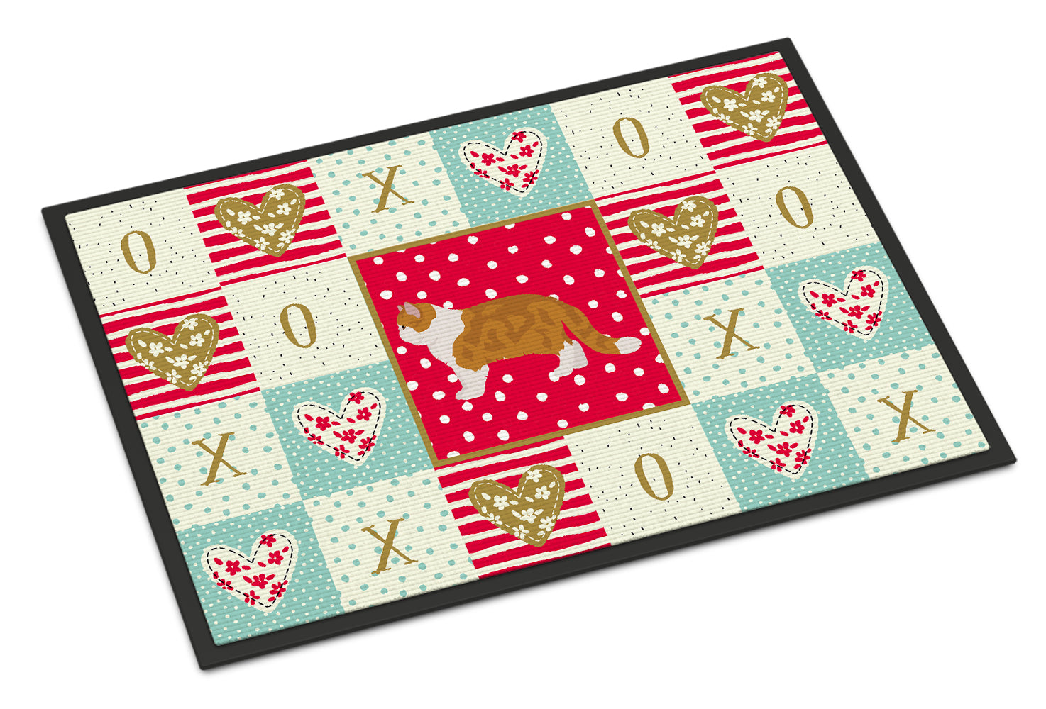 Decorate your space with our Valentine's Day Exotic Shorthair artwork on a Doormat. Welcome your guests in style with our Artwork Door Mat, designed to withstand almost any weather condition. This mat, measuring approximately 24 by 36 inches, is held together by durable black binding tape. Its top layer, composed of polyester felt, is dyed with the eye-catching image you see on the mat. A few layers below provide the mat with stability, while its rubber bottom is stamped to help prevent slipping and ensures safety. Our mat works wonderfully as both an indoor or outdoor door mat. For cleaning, simply hose it off with water or use a power washer - no need for any cleaner that produces suds. Avoid scrubbing with a brush, instead, opt for the vacuum on floor setting. Designed manufactured and printed in the USA, this mat is a perfect addition to your porch, outdoor kitchen, entryway, or any indoor space. Its unique design makes it a charming decorative rug that greets your guests and adds a stylish touch to your home decor.