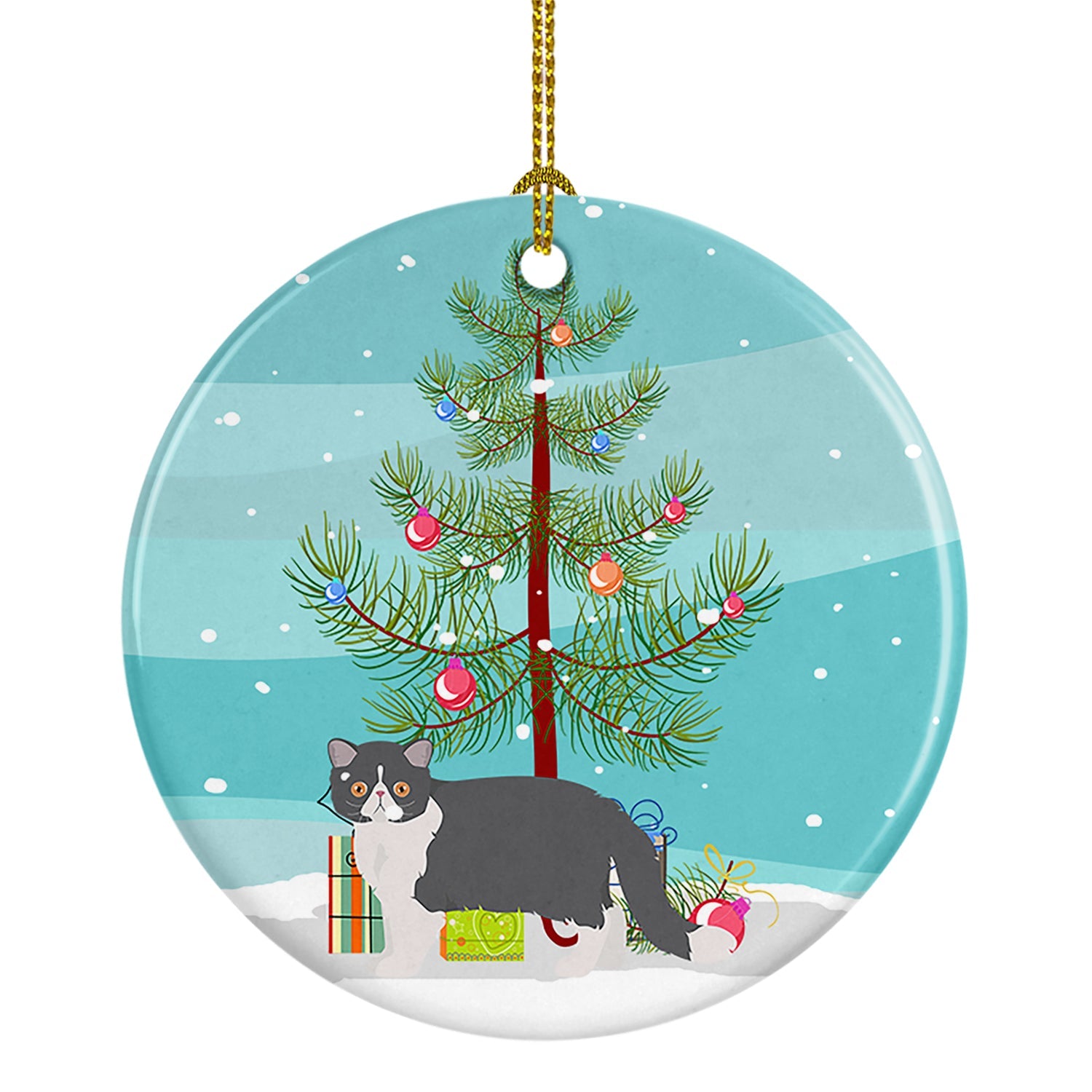 Decorate your space with our Christmas Exotic Shorthair artwork on a Ornament. Add a touch of personalized charm to your Christmas tree this holiday season with our Ceramic Ornament. Measuring 2.8125 inches in diameter, this round porcelain ornament beautifully reflects your festive lights, enhancing your holiday decor. The gloss surface sets off the vibrant, full-color artwork contributed by one of our talented artists, bringing a pop of color and joy to your tree. This Ceramic Ornament doesn't stop at being merely decorative. The white back is designed for personalization. Write a heartfelt message, mark a special year, or inscribe a date with a paint pen or a permanent marker to create a treasured memento. Please ensure you allow any personalization to dry thoroughly before handling to maintain the pristine finish. Included with the ornament is a delicate gold cord for easy hanging. Made in the USA, this Ceramic Ornament makes an exceptional gift for a pet sitter, teacher, family member, or anyone you wish to share a little Christmas magic with. With its blend of style, charm, and personal touch, it's a meaningful addition to any Christmas tree.