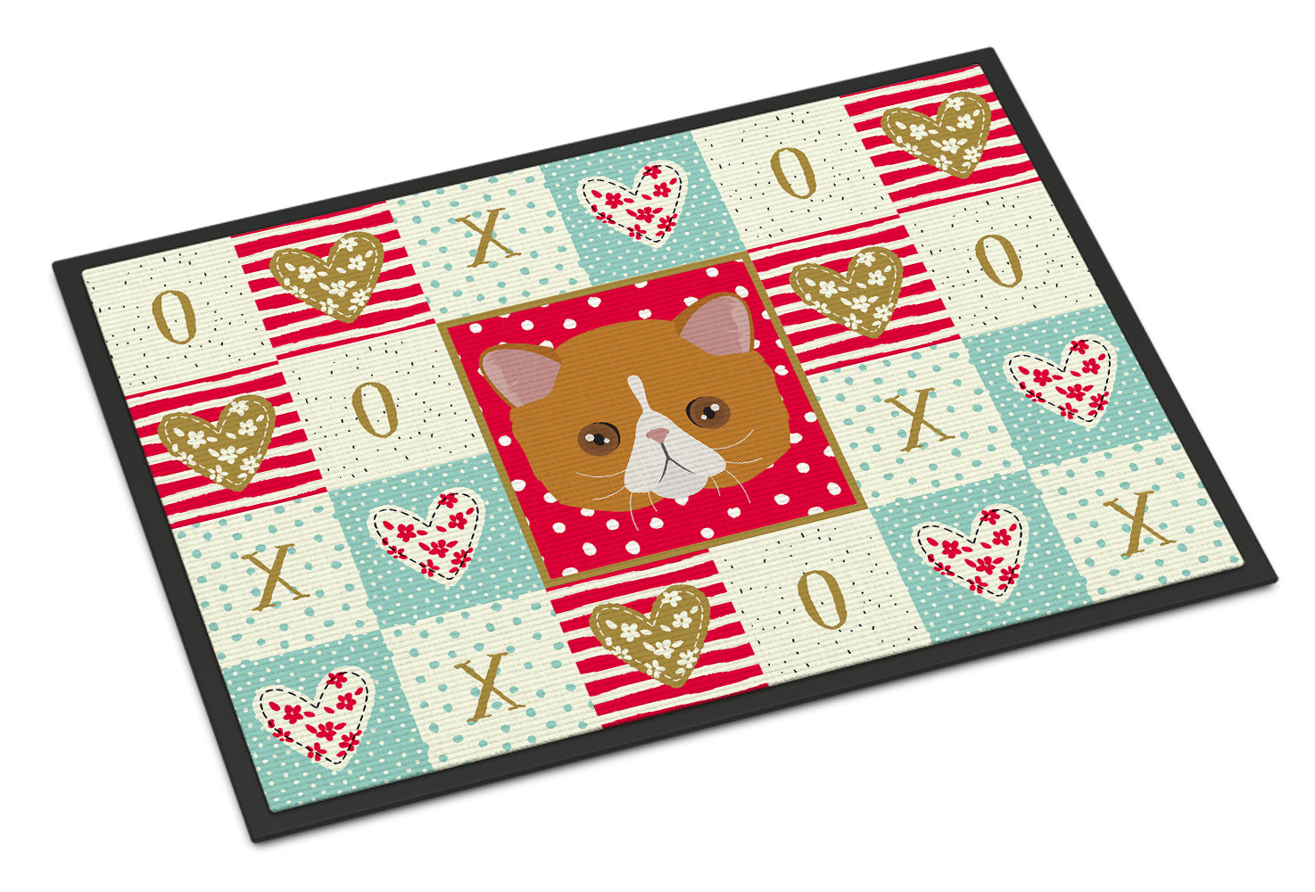 Decorate your space with our Valentine's Day Exotic Shorthair artwork on a Doormat. Welcome your guests in style with our Artwork Door Mat, designed to withstand almost any weather condition. This mat, measuring approximately 24 by 36 inches, is held together by durable black binding tape. Its top layer, composed of polyester felt, is dyed with the eye-catching image you see on the mat. A few layers below provide the mat with stability, while its rubber bottom is stamped to help prevent slipping and ensures safety. Our mat works wonderfully as both an indoor or outdoor door mat. For cleaning, simply hose it off with water or use a power washer - no need for any cleaner that produces suds. Avoid scrubbing with a brush, instead, opt for the vacuum on floor setting. Designed manufactured and printed in the USA, this mat is a perfect addition to your porch, outdoor kitchen, entryway, or any indoor space. Its unique design makes it a charming decorative rug that greets your guests and adds a stylish touch to your home decor.