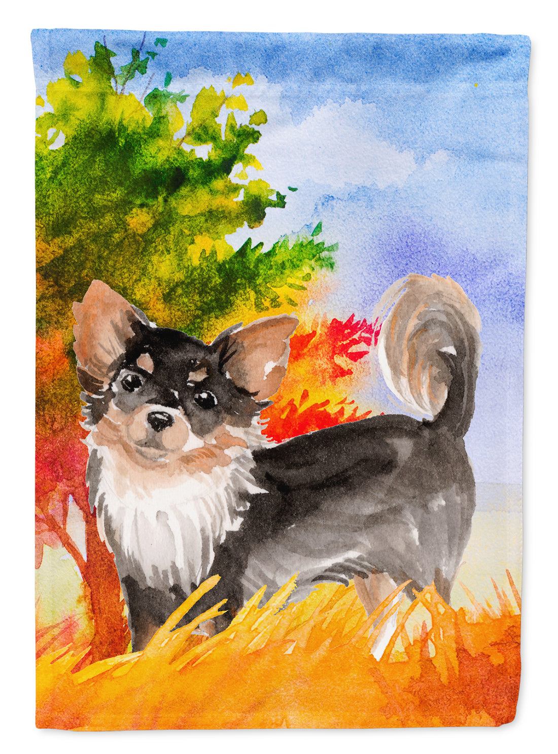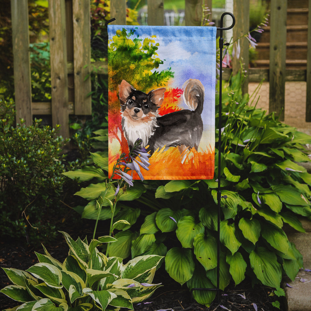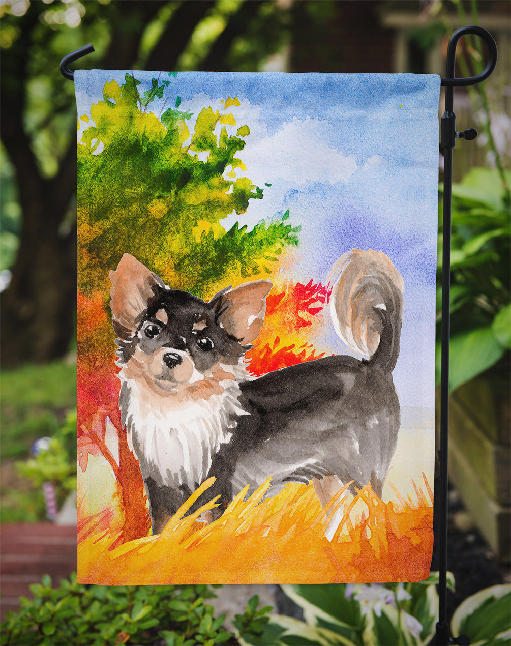 Decorate your space with our Chihuahua artwork on a Garden Flag. Bring a bit of Fall into your home with a Fall Garden Flag. Enhance the beauty of your garden, patio, or yard with Caroline's Treasures Decorative Garden Flag, proudly made in the USA. Crafted from two pieces of thick, double-sided polyester fabric, this 2-ply garden flag is designed to withstand various weather conditions, making it water-resistant and weatherproof. Featuring correctly readable words on both sides, this garden flag offers a delightful visual experience from any angle. With its heavier weight, it stands out among other garden flags, ensuring stability and durability even in wind, rain, and snow. Measuring approximately 11 1/4 inches by 15 1/2 inches, this flag allows you to personalize your outdoor decor. It comes with a 1 1/2-inch sleeve sewn in, allowing easy attachment to any standard garden flag stand or garden size porch hanger (sold separately). Make a statement in your outdoor space with Caroline's Treasures Decorative Garden Flag, a vibrant and high-quality flag that adds color and personality to your surroundings. Proudly made in the USA, it's a symbol of quality craftsmanship and attention to detail.