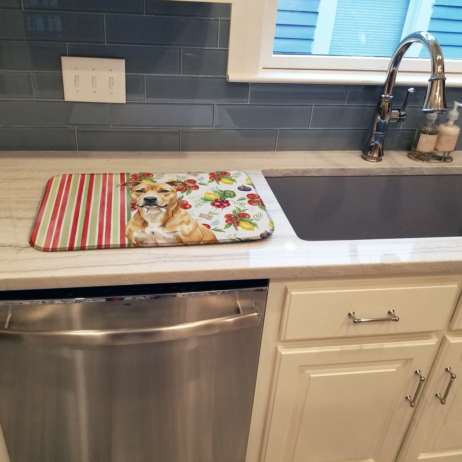 Shown here is the Fawn American Staffordshire Terrier Vegetables Dish Drying Mat from Caroline's Treasures featuring artwork of a American Staffordshire Terrier in a Everyday design. The detailed illustration and vibrant colors make it a standout accent that celebrates both seasonal style and love for the subject. This image features a vibrant watercolor vegetable pattern with tomatoes, lemons, artichokes, figs, radishes, and leafy greens arranged in a repeating design, paired with classic red and green stripes. The bright, garden-fresh palette creates a cheerful, farmhouse-inspired look that feels lively, welcoming, and perfect for kitchen décor. Everyday décor celebrates personal style and the small moments that make a house feel like home. Thoughtful designs add warmth and personality that can be enjoyed year-round. Say goodbye to messy countertops and soggy dish towels with our innovative dish drying mat. Our high-quality dish drying pad is designed to keep your countertops dry while offering a stylish and efficient solution. Whether you're air drying dishes, glasses, stemware, silverware, pots, pans, bottles, or even fruits and vegetables, our dish mat is the perfect choice. The 14 inches x 21 inches size fits most counters and dish drying racks, and the non-slip design ensures stability. Made with water-absorbent polyester and a polyurethane foam insert, our dish drying mat is not only functional but also durable. It's machine washable and printed in the USA for long-lasting use. The beautiful artwork adds flair to your kitchen decor, making it a perfect housewarming gift or present for any occasion. Upgrade your kitchen experience with our absorbent and versatile dish drying mat. Perfect for: Kitchen counters and sinks, everyday dish drying and countertop protection, Dogs-themed homes, or year-round use for American Staffordshire Terrier lovers. American Staffordshire Terriers are muscular dogs with confident posture. Their strong build reflects loyalty and courage. Makes a heartfelt gift for: American Staffordshire Terrier owners, Dogs lovers, Everyday gifts, pet parents, friends who adore their American Staffordshire Terrier, or anyone celebrating Dogs.
