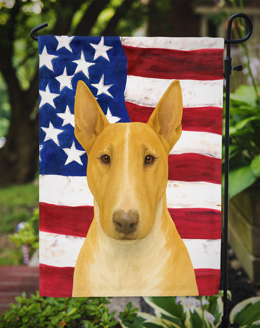 Garden Flag featuring breed specific Bull Terrier artwork. Enhance the beauty of your garden, patio, or yard with Caroline's Treasures Decorative Garden Flag, proudly made in the USA. Crafted from two pieces of thick, double-sided polyester fabric, this 2-ply garden flag is designed to withstand various weather conditions, making it water-resistant and weatherproof. Featuring correctly readable words on both sides, this garden flag offers a delightful visual experience from any angle. With its heavier weight, it stands out among other garden flags, ensuring stability and durability even in wind, rain, and snow. Measuring approximately 11 1/4 inches by 15 1/2 inches, this flag allows you to personalize your outdoor decor. It comes with a 1 1/2-inch sleeve sewn in, allowing easy attachment to any standard garden flag stand or garden size porch hanger (sold separately). Make a statement in your outdoor space with Caroline's Treasures Decorative Garden Flag, a vibrant and high-quality flag that adds color and personality to your surroundings. Proudly made in the USA, it's a symbol of quality craftsmanship and attention to detail.