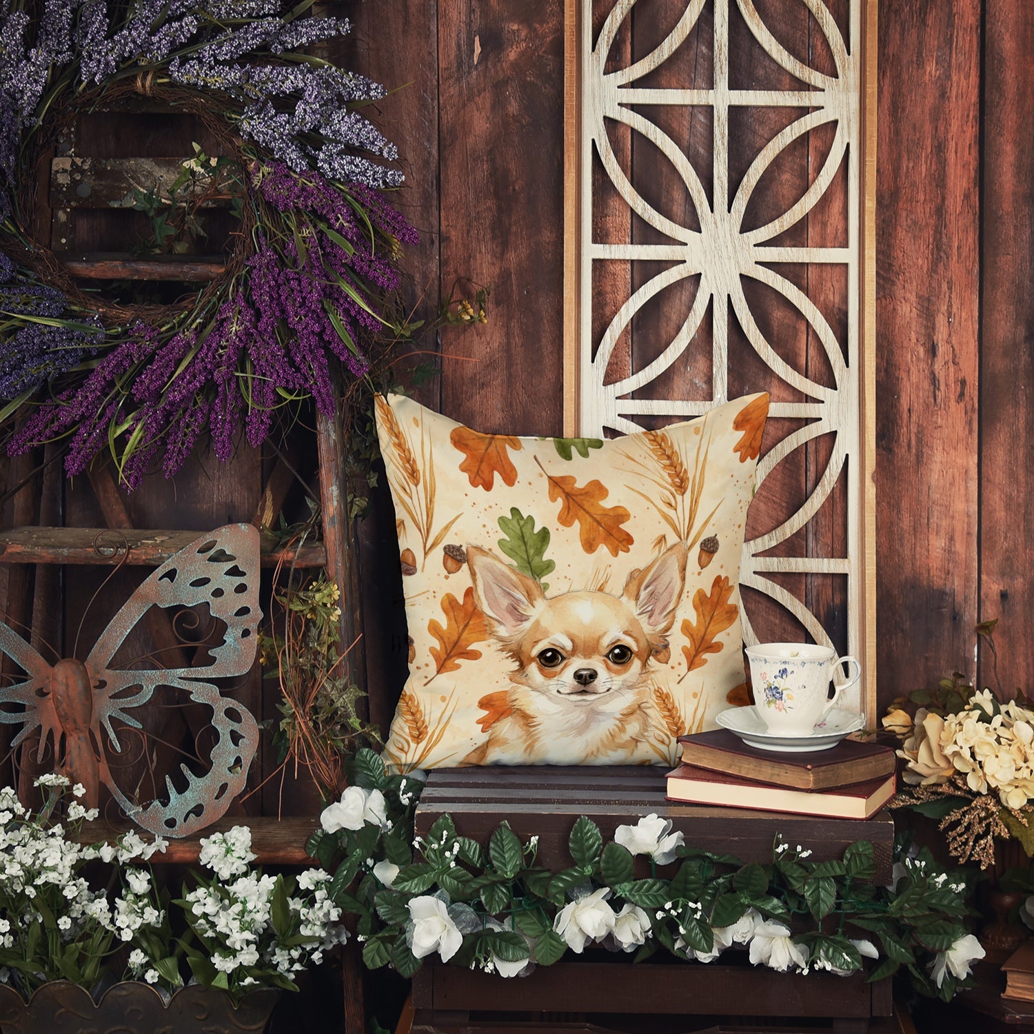 Throw Pillow featuring breed specific Chihuahua artwork. Celebrate Thanksgiving with this Thanksgiving Pillow. Revitalize your outdoor or indoor living space with Caroline's Treasures 18x18 Fabric Decorative Pillow. With a generously sized dimension of approximately 18 inches by 18 inches, this pillow makes a comfortable and aesthetic addition to any seating area. Made from a unique, water-resistant material developed by Caroline's Treasures, the pillow sham is 100% polyester fabric that's durable and ready to weather any condition. Its vibrant, full-color artwork will not fade over time as it is dyed with color-fast dyes. Whether you place it on your patio furniture, porch, veranda, or indoor couch, its soft canvas fabric ensures a cozy experience. The pillow is handcrafted in the United States, featuring a sham created from three pieces of fabric and a polyester insert for enduring shape and overstuffed comfort. Despite being robustly built to endure the outdoors, it is as soft and snug as your favorite indoor cushions. Please note, as all our pillows are handmade, sizes may vary slightly, adding to the charm of this unique decorative item.