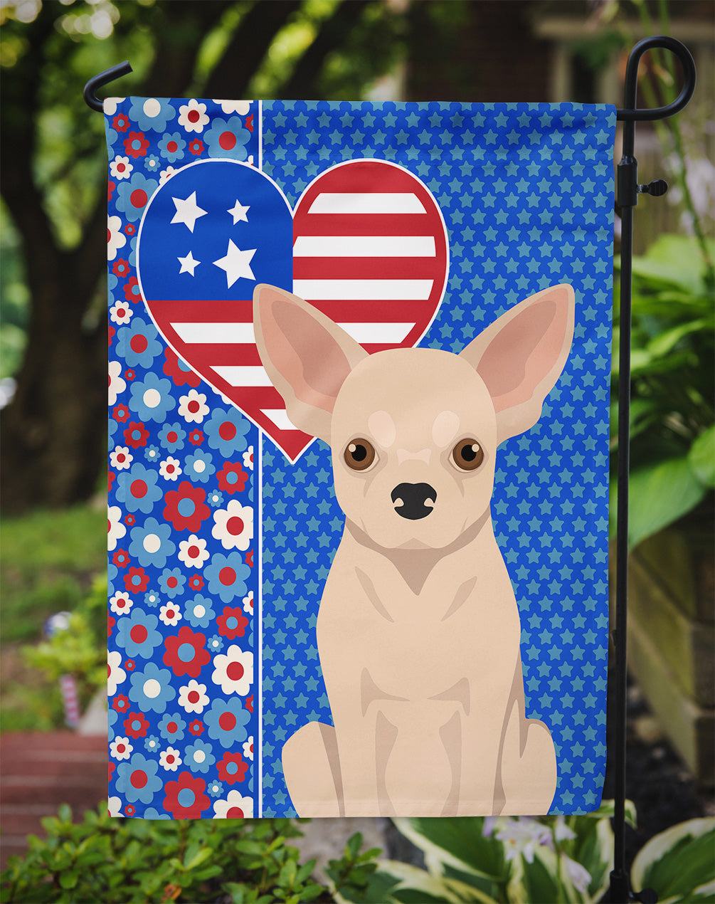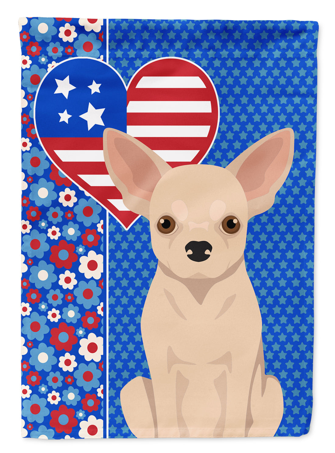 Fawn Chihuahua Patriotic Heart Garden Flag – Red, White & Blue Dog Decor with Star Background