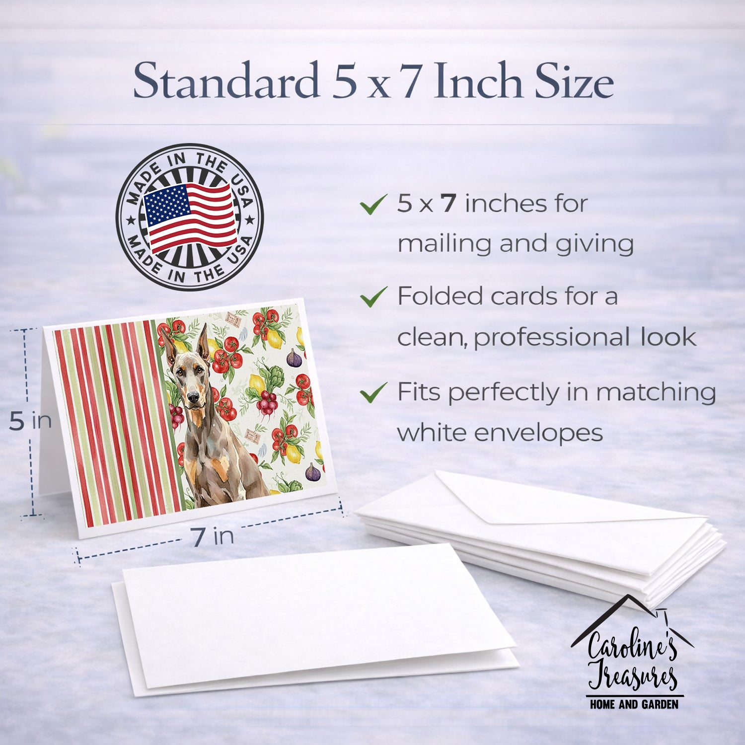 Shown here is the Fawn Doberman Pinscher Vegetables Greeting Cards Pack of 8 from Caroline's Treasures featuring artwork of a Doberman Pinscher in a Everyday design. The detailed illustration and vibrant colors make it a standout accent that celebrates both seasonal style and love for the subject. This image features a vibrant watercolor vegetable pattern with tomatoes, lemons, artichokes, figs, radishes, and leafy greens arranged in a repeating design, paired with classic red and green stripes. The bright, garden-fresh palette creates a cheerful, farmhouse-inspired look that feels lively, welcoming, and perfect for kitchen décor. Everyday décor celebrates personal style and the small moments that make a house feel like home. Thoughtful designs add warmth and personality that can be enjoyed year-round. Celebrate special moments with Caroline's Treasures Printed Greeting Card Pack. This pack includes eight beautifully folded 5x7 cards, accompanied by eight matching white envelopes. With blank interiors, these cards provide ample space for your personalized messages and heartfelt holiday greetings. Each card features captivating full-color artwork, meticulously printed in our facility on high-quality 80 lb cover stock or 216 GSM. The super smooth finish of the white cards enhances the visual impact of the artwork, creating a truly stunning presentation. Designed by our talented in-house artists or licensed artists, the artwork on these cards showcases their creativity and attention to detail. From vibrant illustrations to captivating designs, each card tells its own unique story. Whether it's for birthdays, anniversaries, holidays, or any special occasion, Caroline's Treasures Greeting Card Pack is the perfect way to convey your heartfelt sentiments. Share joy, love, and warm wishes with these exquisite cards and make every moment unforgettable. Perfect for: Writing personal messages, everyday correspondence, and thoughtful notes, Dogs-themed stationery collections, or year-round use for Doberman Pinscher lovers. Doberman Pinschers are sleek, athletic dogs with confident posture. Their appearance reflects strength and loyalty. Makes a heartfelt gift for: Doberman Pinscher owners, Dogs lovers, Everyday gifts, pet parents, friends who adore their Doberman Pinscher, or anyone celebrating Dogs.