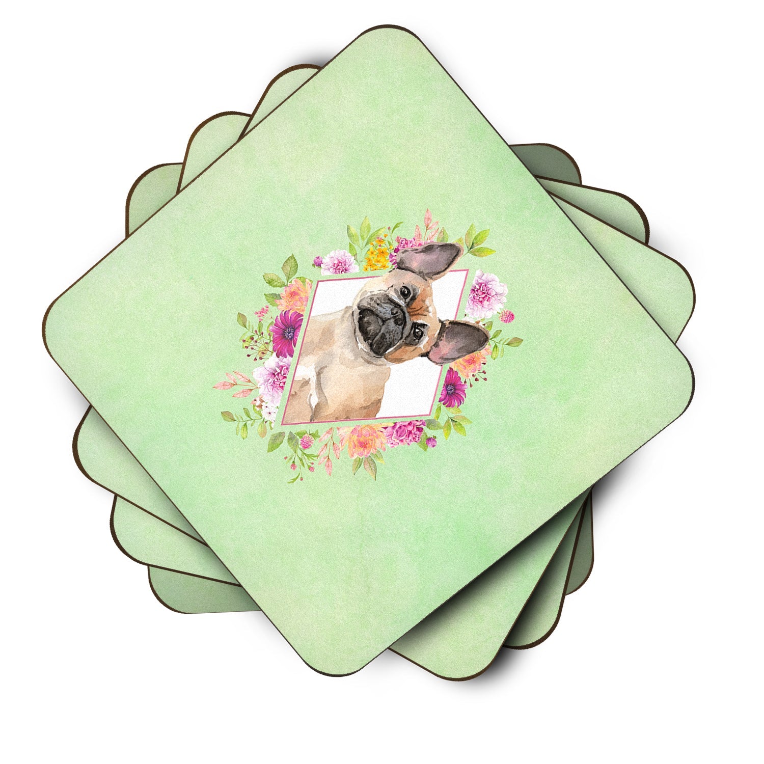 Fawn French Bulldog Green Flowers Coasters - Set of 4 Lightweight Foam, Absorbent Drink Coasters  CK4398FC