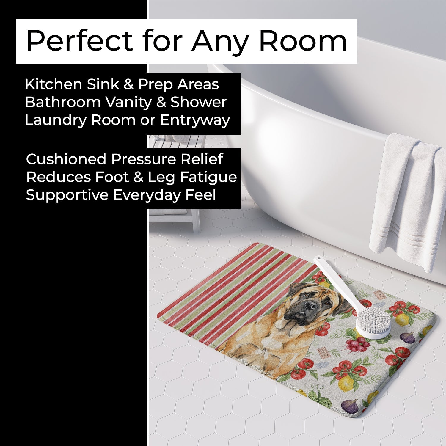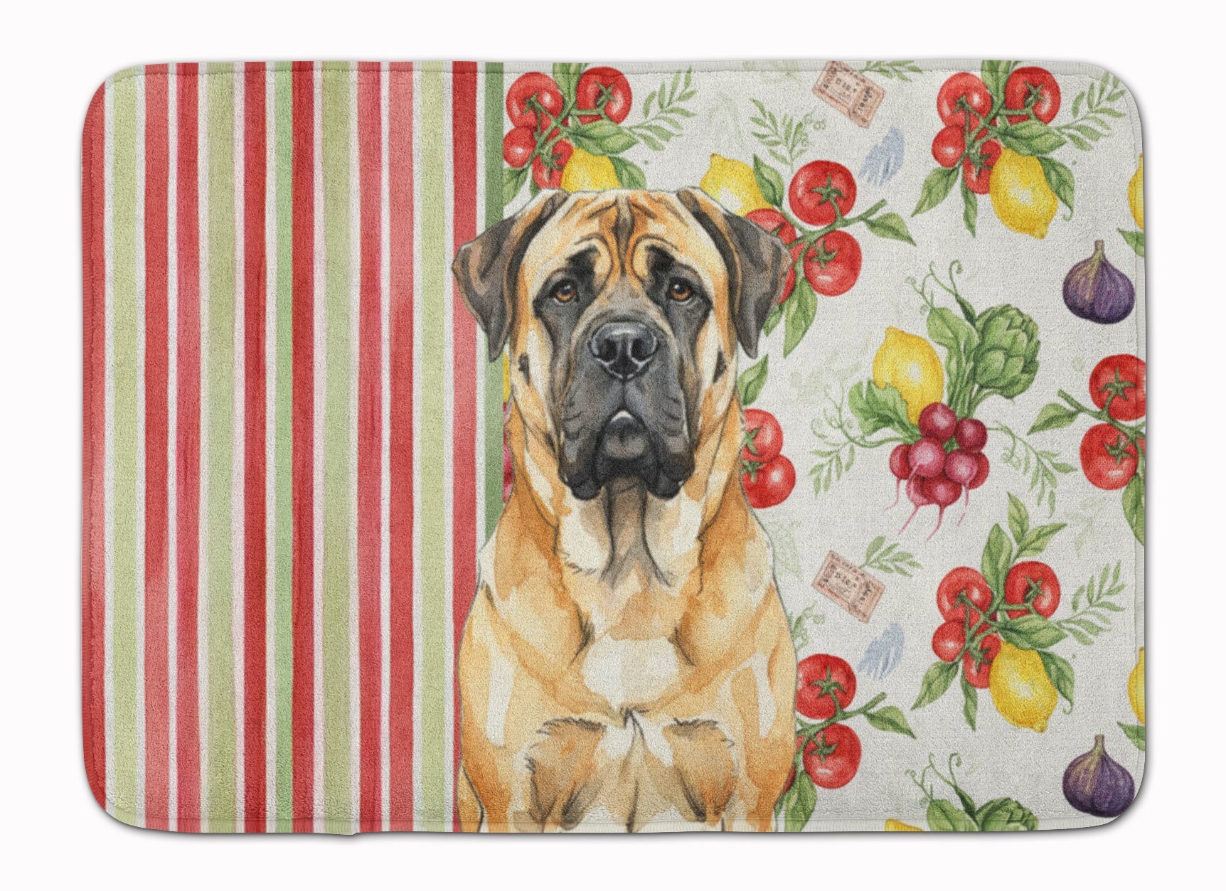 Shown here is the Fawn Mastiff Vegetables Memory Foam Kitchen Mat from Caroline's Treasures featuring artwork of a Mastiff in a Everyday design. The detailed illustration and vibrant colors make it a standout accent that celebrates both seasonal style and love for the subject. This image features a vibrant watercolor vegetable pattern with tomatoes, lemons, artichokes, figs, radishes, and leafy greens arranged in a repeating design, paired with classic red and green stripes. The bright, garden-fresh palette creates a cheerful, farmhouse-inspired look that feels lively, welcoming, and perfect for kitchen décor. Everyday décor celebrates personal style and the small moments that make a house feel like home. Thoughtful designs add warmth and personality that can be enjoyed year-round. Transform your floor into a work of art with Caroline's Treasures' Memory Foam Mat. This mat offers not only a stunning visual appeal but also a luxurious, plush feel that's incredibly comfortable to the touch. It's a versatile, machine-washable mat designed for both bath and kitchen use, ensuring you experience the best in comfort and convenience. Care Instructions: Maintaining this memory foam mat is a breeze. Simply follow the care instructions on the product tag. It's recommended to wash in cold water and dry on a low-temperature setting in the dryer. This ensures the mat retains its quality and longevity, allowing you to enjoy its beauty and comfort for a long time. Caroline's Treasures' Memory Foam Mat Machine Washable is the perfect blend of artistry, comfort, and practicality, making it a standout addition to any space. Upgrade your home decor with this versatile and stylish mat today. Mastiffs are massive guardian dogs known for their calm temperament and protective instincts. This ancient breed is respected for its loyalty, patience, and steady presence. Makes a heartfelt gift for: Mastiff owners, Dogs lovers, Everyday gifts, pet parents, friends who adore their Mastiff, or anyone celebrating Dogs.