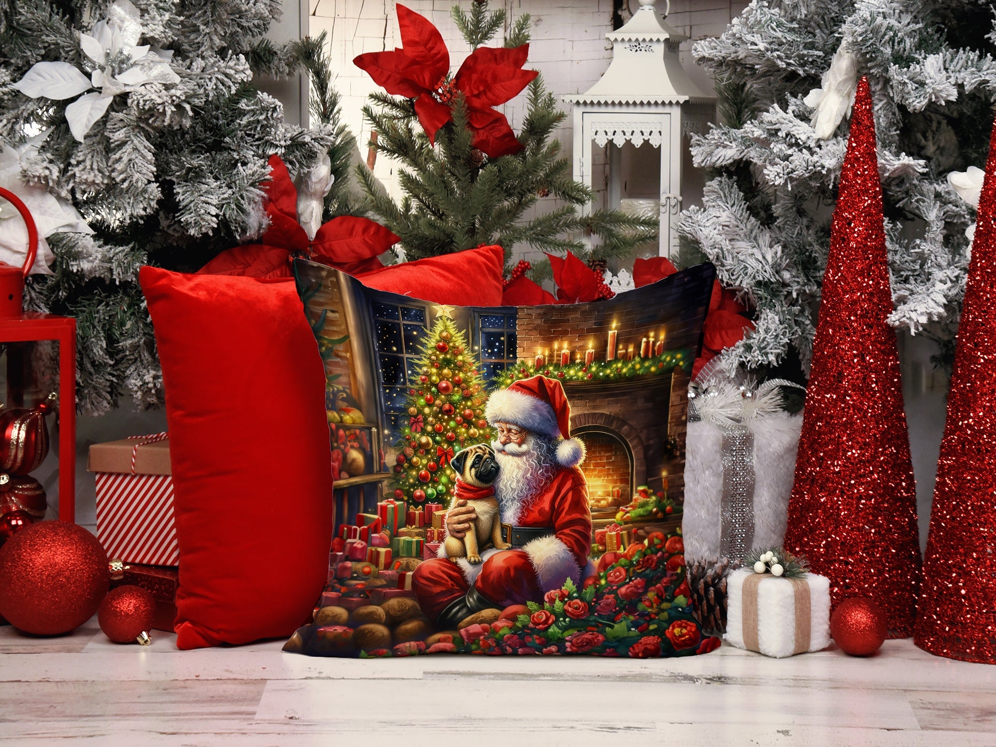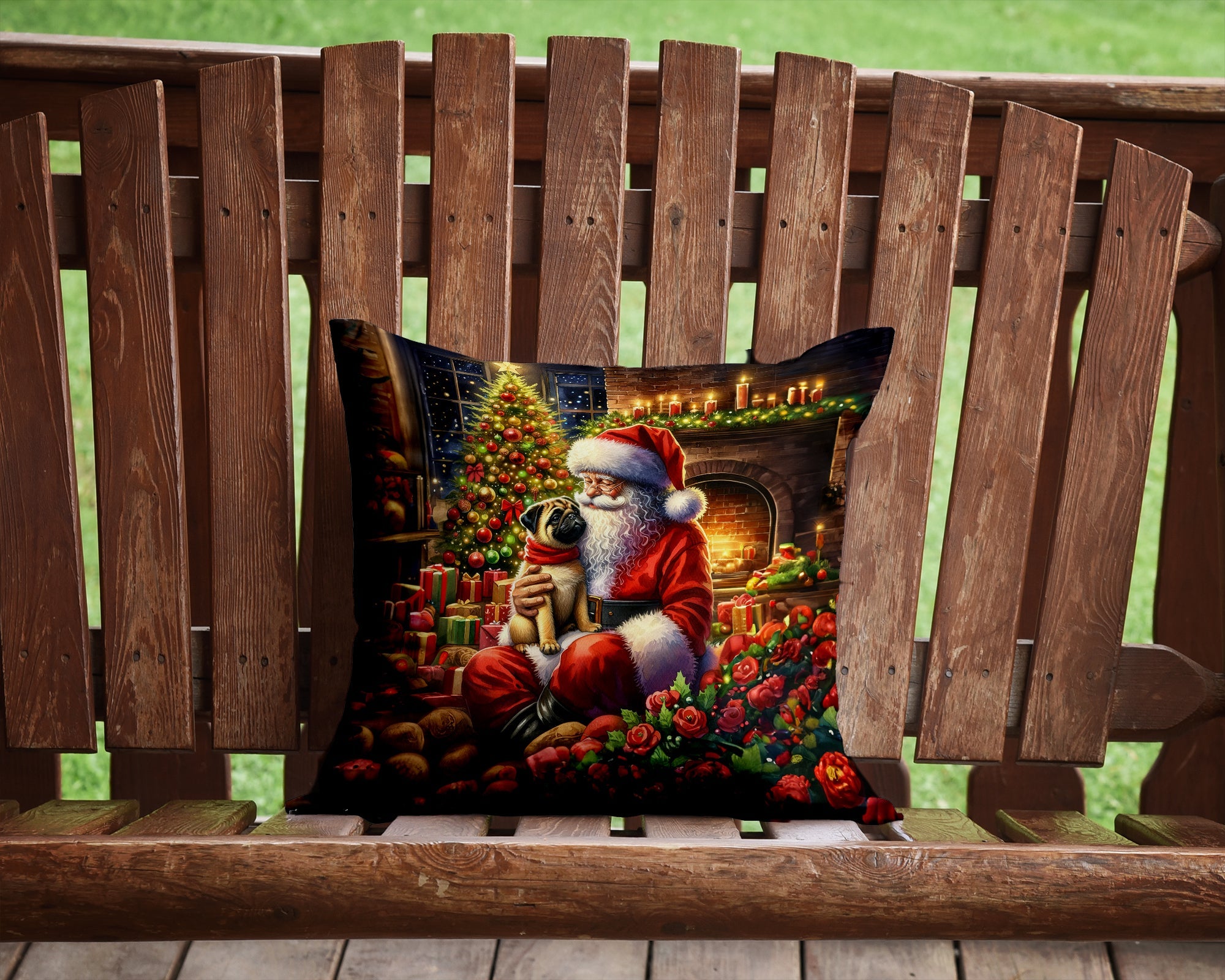 Throw Pillow featuring breed specific Pug artwork. Celebrate Christmas with this Christmas Pillow. Add a touch of vibrancy and comfort to your outdoor seating with Caroline's Treasures Fabric Decorative Pillow. Measuring approximately 14 inches by 14 inches, this outdoor pillow is crafted to elevate the appeal of your patio furniture, infusing it with vivid color and artistic flair. The pillow includes a 100% Polyester Fabric sham filled with a quality pillow form to provide superior comfort. Innovatively made from our brand new material, specifically woven for its water resistance, this pillow is designed for durability. The soft canvas fabric offers versatility in use, fit for your indoor couch or your outdoor patio, porch, or veranda. The fabric is dyed with colorfast dyes built for resilience against weather conditions, ensuring the pillow retains its beauty over time. Constructed by sewing three fabric pieces to create a sham, the polyester insert is then nestled inside to form the pillow, resulting in an overstuffed pillow that maintains its shape. Both the sham and the pillow insert are proudly made in the United States. As the pillows are handcrafted, there may be minor variations in size, further enhancing their unique charm. Experience comfort in style with Caroline's Treasures Fabric Decorative Pillow.