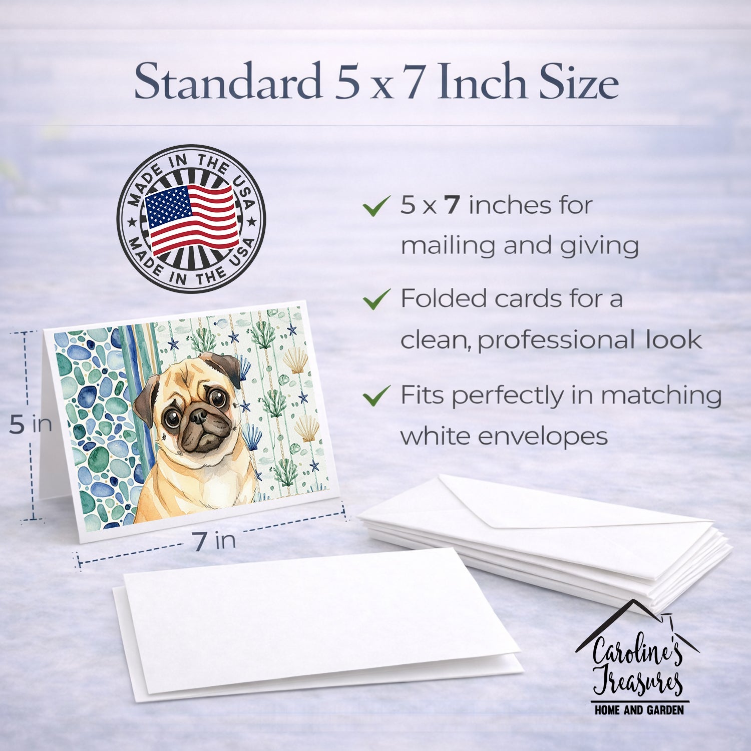 Shown here is the Fawn Pug Coastal Sea Glass Greeting Cards Pack of 8 from Caroline's Treasures featuring artwork of a Pug in a Everyday design. The detailed illustration and vibrant colors make it a standout accent that celebrates both seasonal style and love for the subject. This image features a calming coastal watercolor pattern with soft seashells, seaweed, starfish, and pebble-inspired accents arranged in a repeating design. The soothing palette of blues, greens, and sandy neutrals creates a relaxed, beach-inspired look that adds a fresh and tranquil feel to any space. Everyday décor celebrates personal style and the small moments that make a house feel like home. Thoughtful designs add warmth and personality that can be enjoyed year-round. Celebrate special moments with Caroline's Treasures Printed Greeting Card Pack. This pack includes eight beautifully folded 5x7 cards, accompanied by eight matching white envelopes. With blank interiors, these cards provide ample space for your personalized messages and heartfelt holiday greetings. Each card features captivating full-color artwork, meticulously printed in our facility on high-quality 80 lb cover stock or 216 GSM. The super smooth finish of the white cards enhances the visual impact of the artwork, creating a truly stunning presentation. Designed by our talented in-house artists or licensed artists, the artwork on these cards showcases their creativity and attention to detail. From vibrant illustrations to captivating designs, each card tells its own unique story. Whether it's for birthdays, anniversaries, holidays, or any special occasion, Caroline's Treasures Greeting Card Pack is the perfect way to convey your heartfelt sentiments. Share joy, love, and warm wishes with these exquisite cards and make every moment unforgettable. Perfect for: Writing personal messages, everyday correspondence, and thoughtful notes, Dogs-themed stationery collections, or year-round use for Pug lovers. Pugs are charming companion dogs known for their expressive faces and affectionate personality. This breed is loved for its loyalty, playful nature, and strong bond with family. Makes a heartfelt gift for: Pug owners, Dogs lovers, Everyday gifts, pet parents, friends who adore their Pug, or anyone celebrating Dogs.