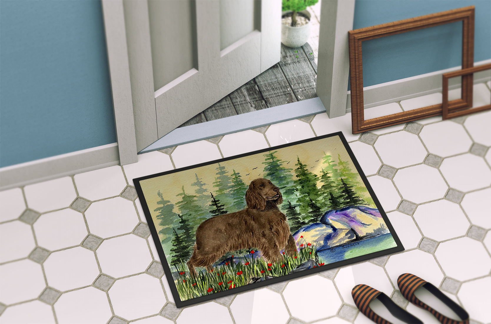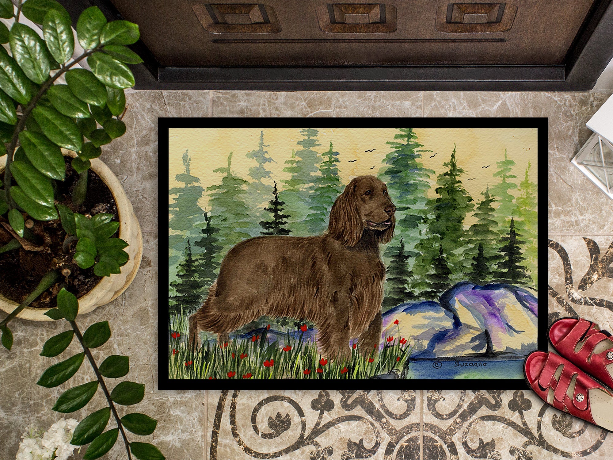 Decorate your space with our Field Spaniel artwork on a Doormat. Welcome your guests in style with our Artwork Door Mat, designed to withstand almost any weather condition. This mat, measuring approximately 24 by 36 inches, is held together by durable black binding tape. Its top layer, composed of polyester felt, is dyed with the eye-catching image you see on the mat. A few layers below provide the mat with stability, while its rubber bottom is stamped to help prevent slipping and ensures safety. Our mat works wonderfully as both an indoor or outdoor door mat. For cleaning, simply hose it off with water or use a power washer - no need for any cleaner that produces suds. Avoid scrubbing with a brush, instead, opt for the vacuum on floor setting. Designed manufactured and printed in the USA, this mat is a perfect addition to your porch, outdoor kitchen, entryway, or any indoor space. Its unique design makes it a charming decorative rug that greets your guests and adds a stylish touch to your home decor.