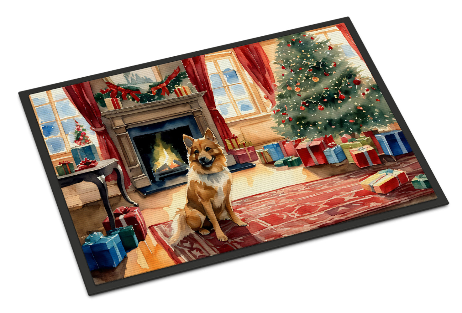 Decorate your space with our Christmas Finnish Spitz artwork on a Doormat. Welcome your guests in style with our Artwork Door Mat, designed to withstand almost any weather condition. This mat, measuring approximately 24 by 36 inches, is held together by durable black binding tape. Its top layer, composed of polyester felt, is dyed with the eye-catching image you see on the mat. A few layers below provide the mat with stability, while its rubber bottom is stamped to help prevent slipping and ensures safety. Our mat works wonderfully as both an indoor or outdoor door mat. For cleaning, simply hose it off with water or use a power washer - no need for any cleaner that produces suds. Avoid scrubbing with a brush, instead, opt for the vacuum on floor setting. Designed manufactured and printed in the USA, this mat is a perfect addition to your porch, outdoor kitchen, entryway, or any indoor space. Its unique design makes it a charming decorative rug that greets your guests and adds a stylish touch to your home decor.