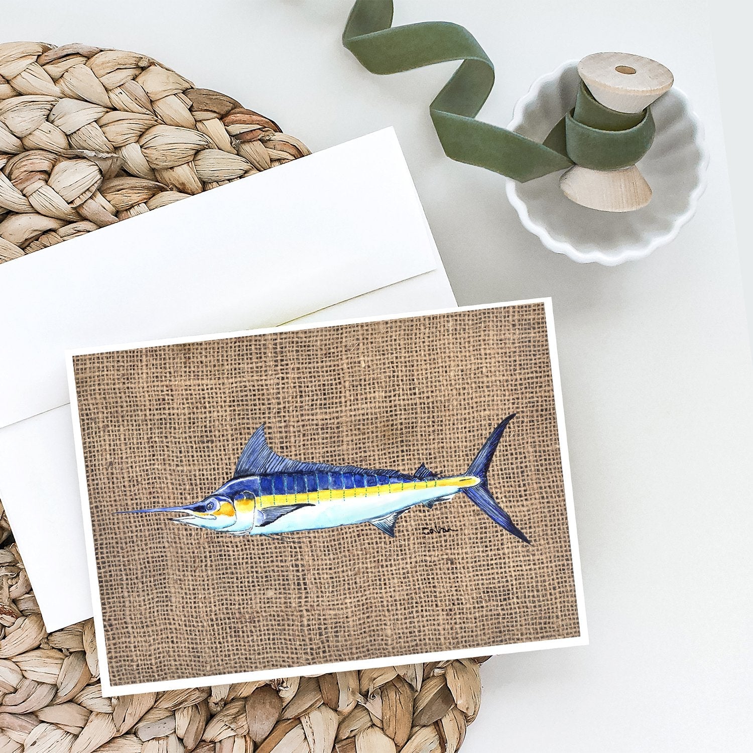 Fish - Marlin Faux Burlap Greeting Cards -  Blank Note Cards – 8-Pack of Artist-Designed Cards with Envelopes