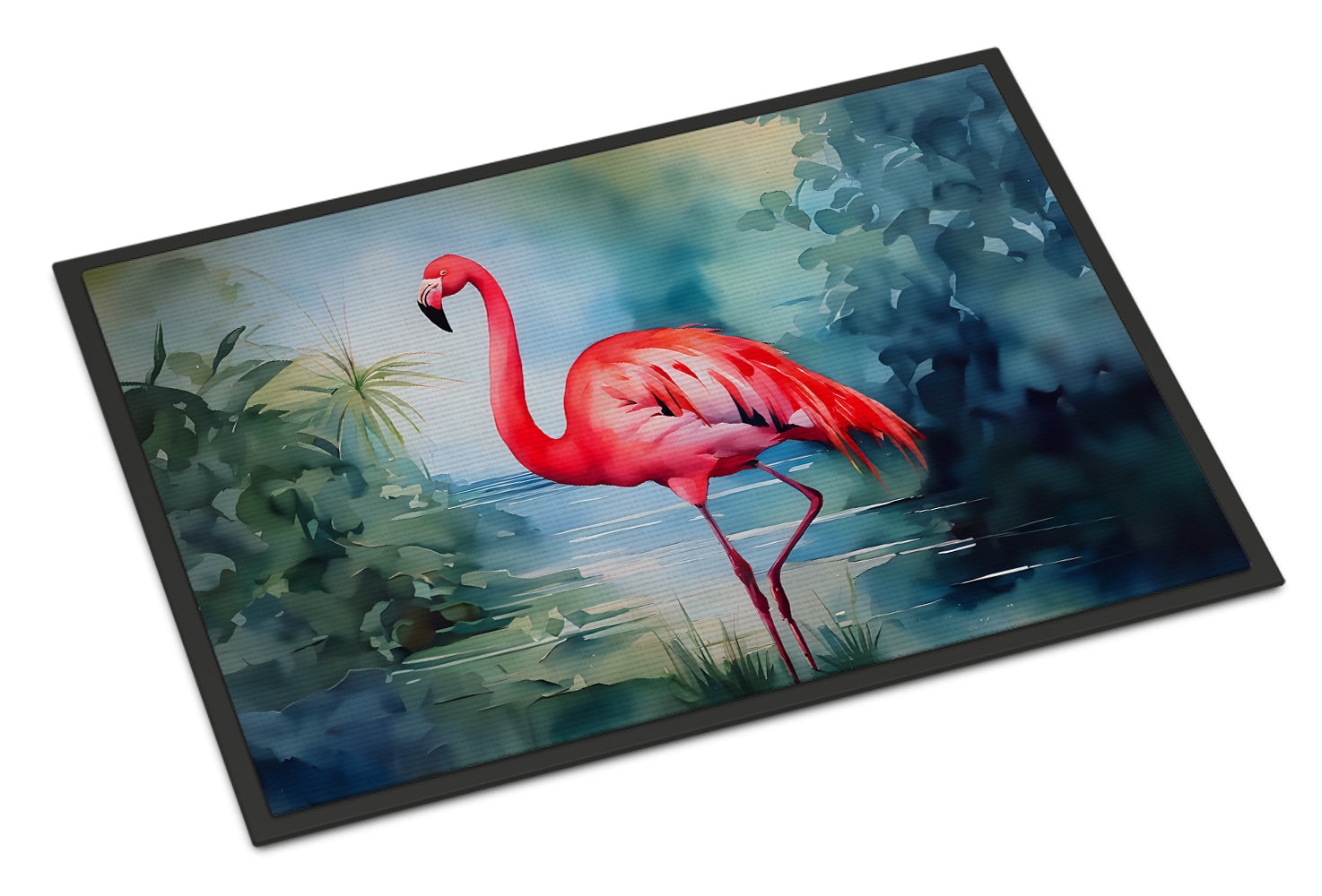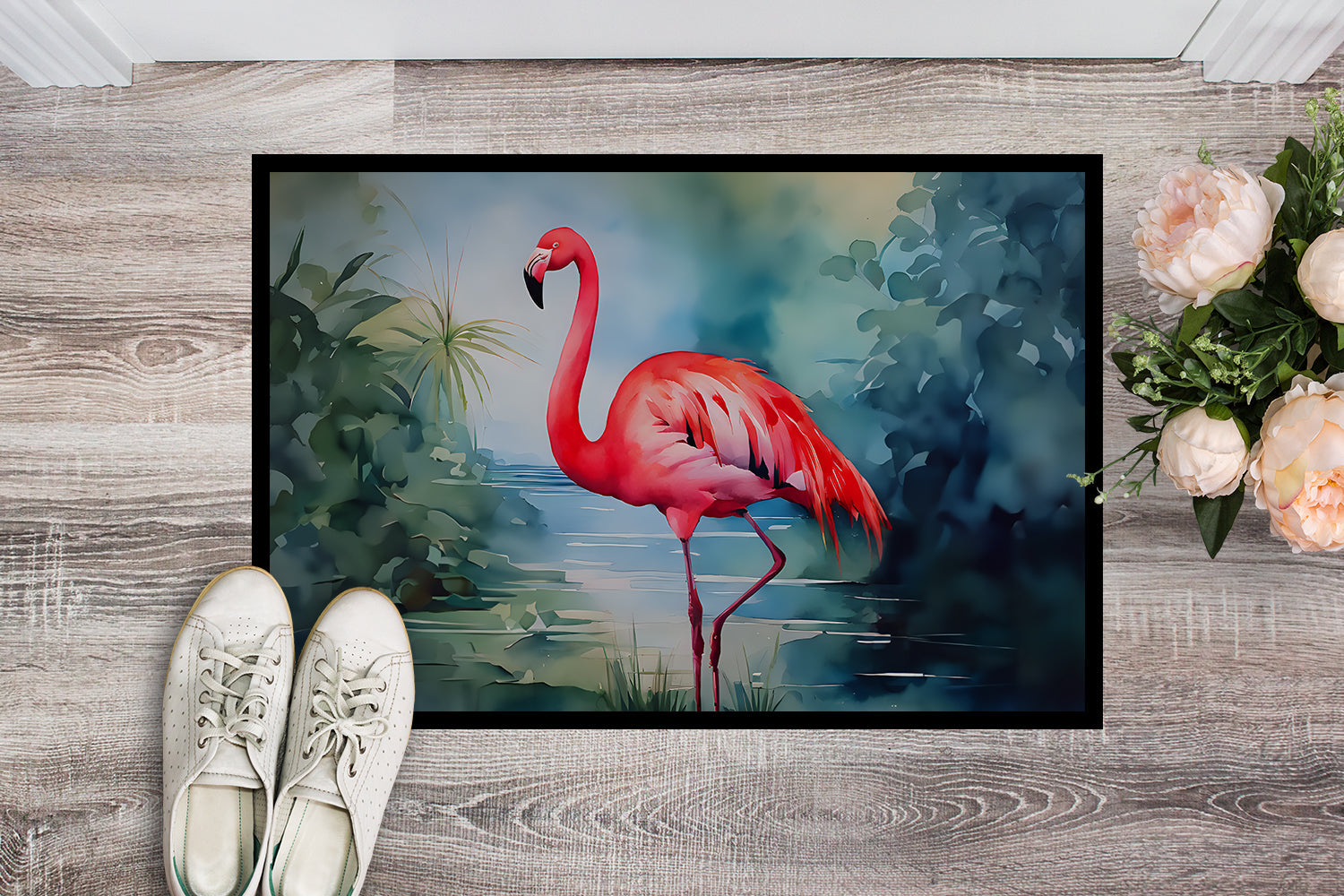 Decorate your space with our Flamingo artwork on a Doormat. Welcome your guests in style with our Artwork Door Mat, designed to withstand almost any weather condition. This mat, measuring approximately 18 by 27 inches, is held together by durable black binding tape. Its top layer, composed of polyester felt, is dyed with the eye-catching image you see on the mat. A few layers below provide the mat with stability, while its rubber bottom is stamped to help prevent slipping and ensures safety. Our mat works wonderfully as both an indoor or outdoor door mat. For cleaning, simply hose it off with water or use a power washer - no need for any cleaner that produces suds. Avoid scrubbing with a brush, instead, opt for the vacuum on floor setting. Designed manufactured and printed in the USA, this mat is a perfect addition to your porch, outdoor kitchen, entryway, or any indoor space. Its unique design makes it a charming decorative rug that greets your guests and adds a stylish touch to your home decor.