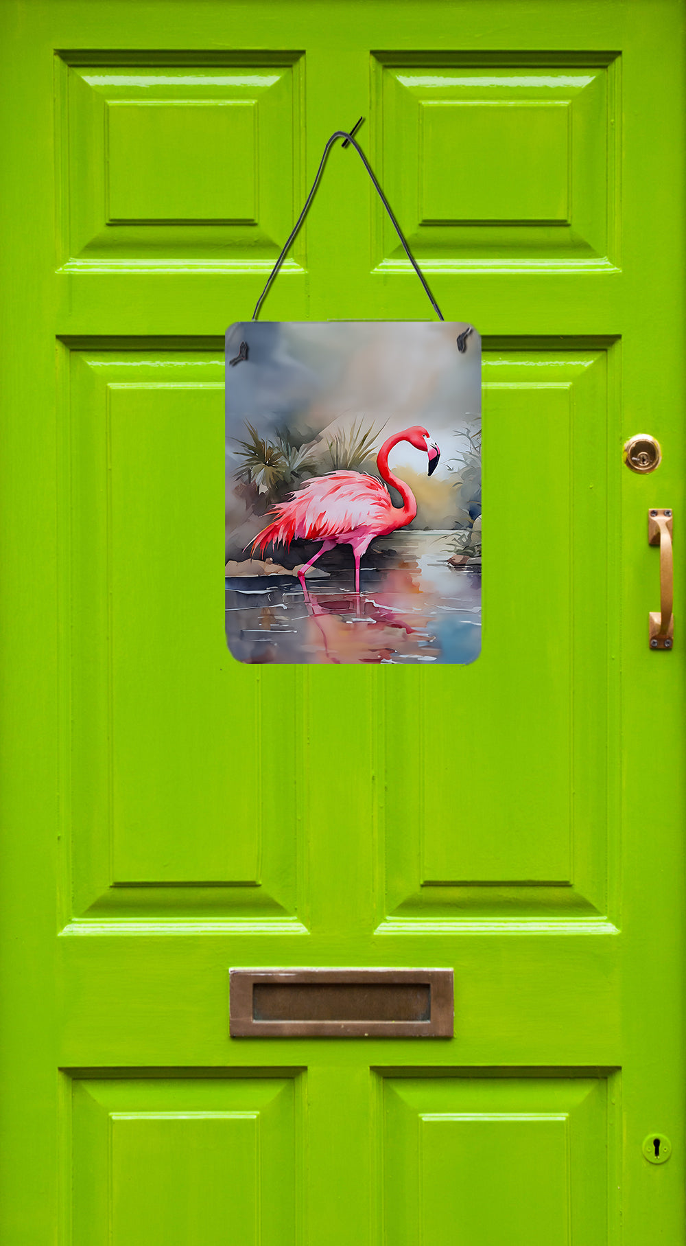 Wall or Door Hanging Prints featuring breed specific Flamingo artwork. Spruce up your space with our Indoor or Outdoor Aluminum Artwork Prints. Designed to brighten your kitchen, bathroom, office, or outdoor areas like patios and porches, these prints offer a unique way to decorate your home or workspace. Measuring 12 by 16 inches, the prints are vibrant, full color, and bring an element of artistry to any setting. What makes these prints special is their durability and resistance to the elements. If placed outside, they can withstand direct sunlight for a considerable time before showing signs of fading. Crafted from rust and fade-resistant aluminum, these prints are built to last and maintain their vibrant colors. Each print comes with a black hanging rope and rounded corners for safety. The back of the print showcases a brushed silver color, adding a touch of sophistication. The lightweight design allows easy hanging with virtually any nail or screw, making installation a breeze. Whether indoors or outdoors, these prints add a distinctive touch to any space.